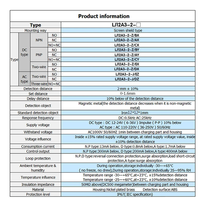 : DC PNP 3 hilos normalmente abierto 12mm de diámetro; Distancia de detección de 2mm.