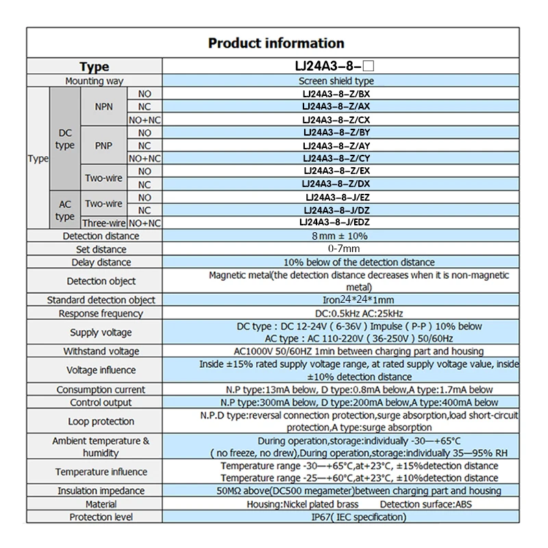 LJ24A3-8-Z/AY: 3 cables CC PNP normalmente cerca de 24mm de diámetro; 8mm de distancia de detección
