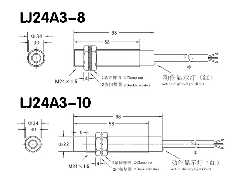 LJ24A3-10-Z/DX: dos cables CC normalmente cerca de 24mm de diámetro; 10mm de distancia de detección