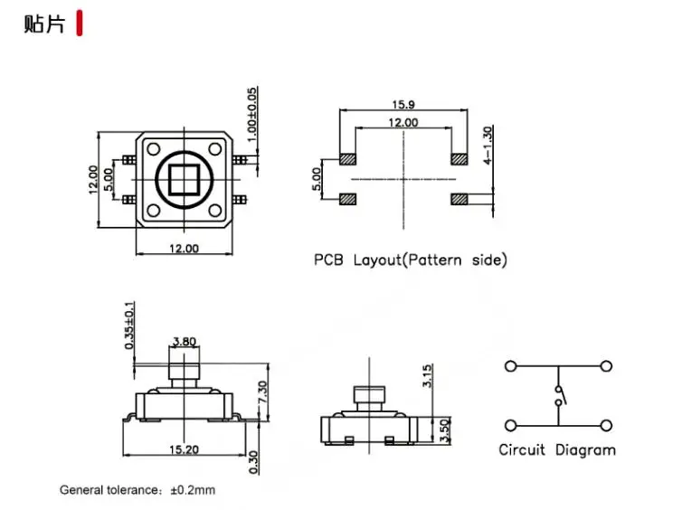 Comprar Interruptor táctil de luz SMD, microinterruptor de 4 pines, resistente a altas temperaturas, 10 piezas, 12x12x7,3mm, 12x12x7,3mm