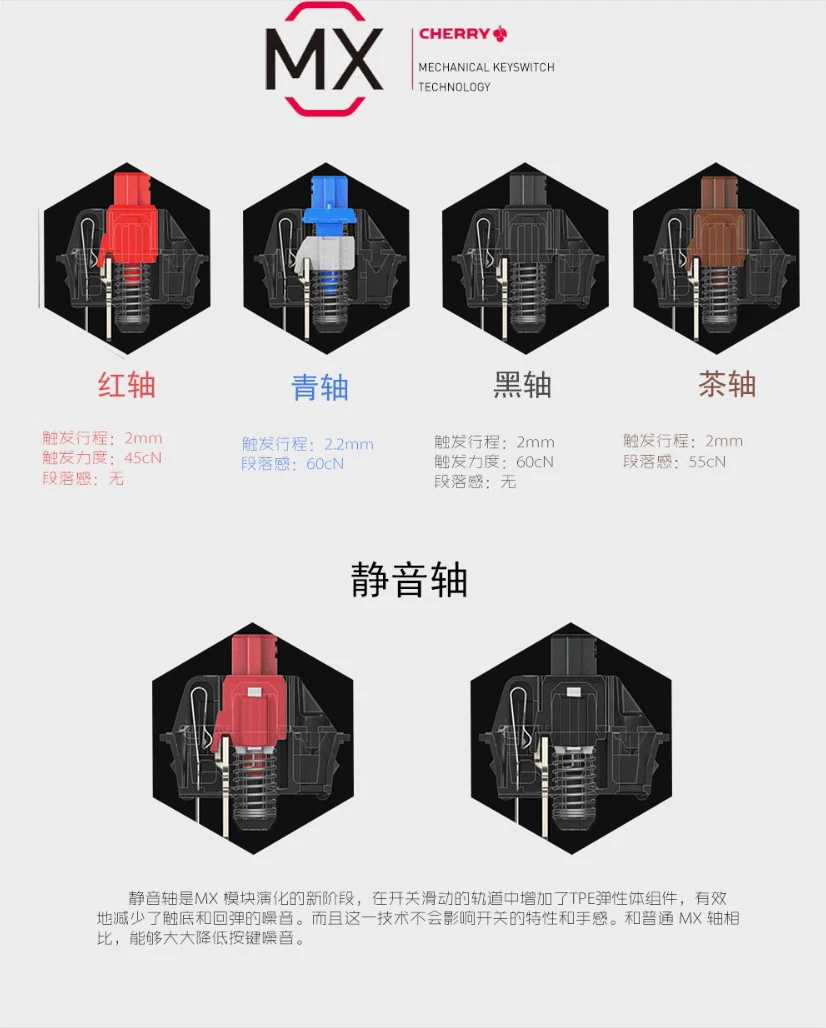 Nota: Estos interruptores pueden usar LED de 3mm, 1,8mm, 2x3x4mm. Si desea utilizar 4 clavos RGB, debe cavar 2 agujeros o reemplazar la cubierta del interruptor. Los interruptores de cereza tienen dos conjuntos diferentes de signos, pero ambos son originales. Se enviará al azar. Cherry switch Black MX Cherry: Linear Switch, Performance 60cn MX Cherry Red: Linear Switch, Driving Force 45 CN Cherry Mix Roses: una versión más silenciosa de color rojo cereza llamada Cherry Roses Blue Cherry MX Tactile Switch and Click, Working Force 50 Brown Cherry MX: Interruptor táctil, sin clic, 45 CN, Tacto suave Green Cherry MX: Touch and Click, versión azul más fuerte, Action Power 80 CN Ciertamente Cherry MX: No Touch, versión marrón más dura, acción de 55 CN, toque de 65 CN. Cherry MX Milk: Llamado White MX en el mundo, es táctil y funciona con un clic, versión azul rigurosa, el poder de acción es 80 CN. Cereza plateada: Interruptor lineal, 40% más rápido que el rojo cereza, ligeramente más pesado que el rojo, bueno para los jugadores. Gris cereza lineal: Interruptor lineal, ligeramente más pesado que el negro cereza (el stock es pequeño, por lo que no vendemos al por mayor) Tacto gris cereza: tacto bajo y sin clic, llamado marrón pesado, Se asemeja a un MX transparente y se puede actualizar hasta 120g de peso.