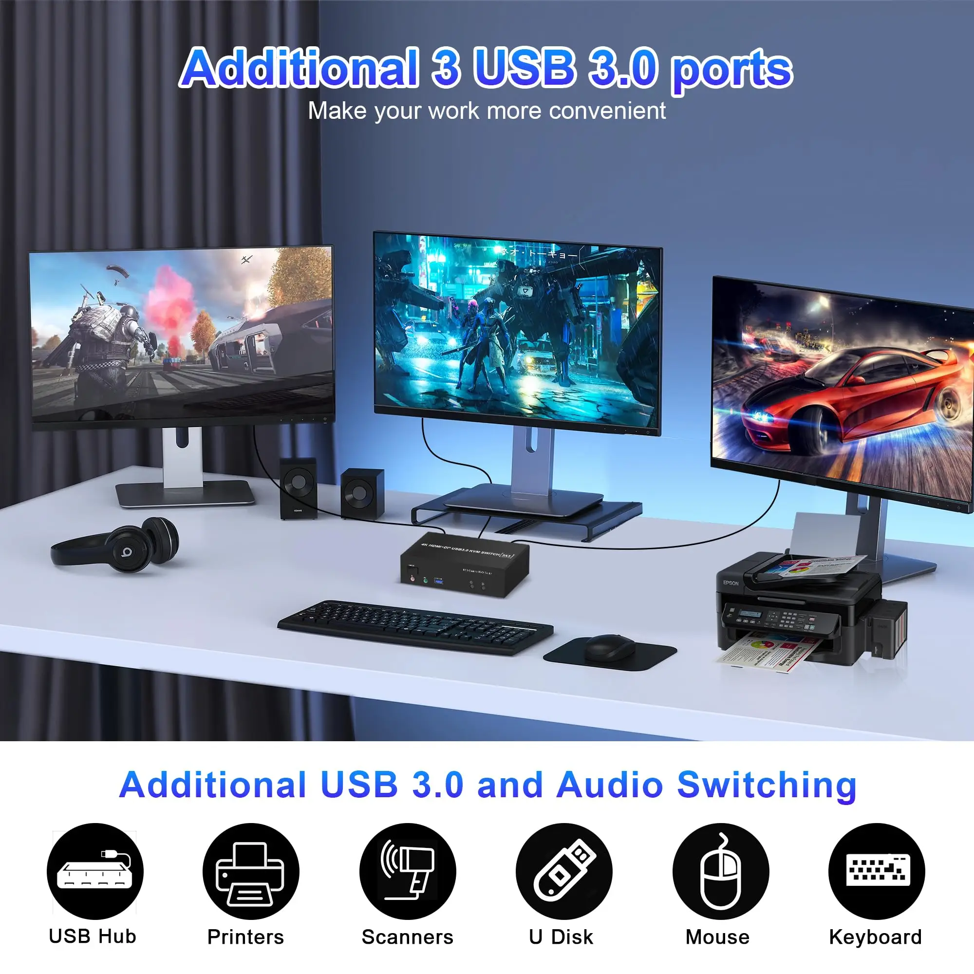 Conmutador KVM HDMI + 2 Displayport USB 3,0 Triple Monitor para 2 Ordenadores, Conmutador KVM 4K @ 60Hz 2 Ordenadores x 3 Monitores con Salida de Audio Micrófono y 3 Puertos USB 3,0, Conmutador Teclado Mouse