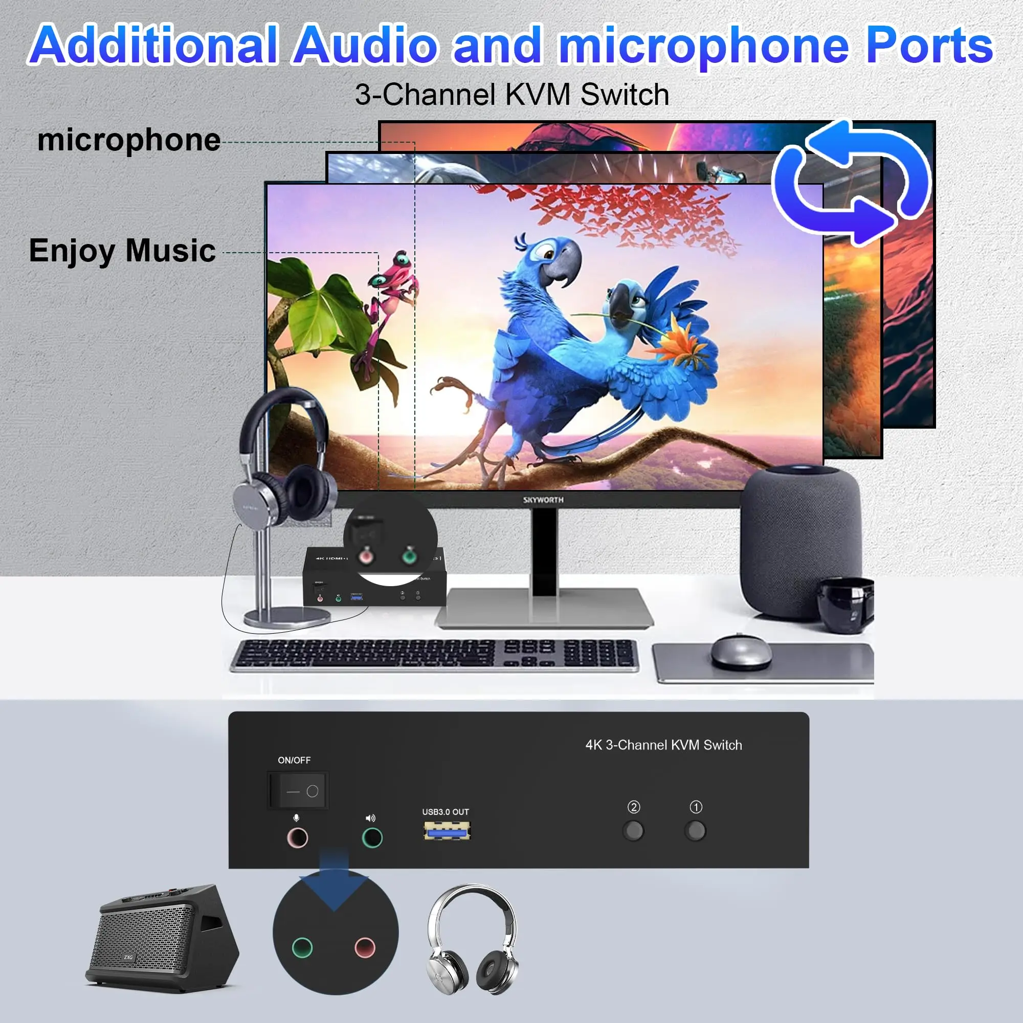 【 3 USB3.0 y salida de audio y micrófono】Triple Monitor (1 * HDMI + 2 * DisplayPort) Conmutador KVM con 3 puertos USB 3,0 integrados que pueden reconocer teclado, ratón, impresora, escáner y otros dispositivos USB. Admite transferencia de datos USB 3,0 ultrarrápida de hasta 5Gbps, retrocompatible con dispositivos USB 2,0/1,1. El diseño mejorado oculta los cables desordenados en la parte posterior, dejando un puerto USB 3,0 en la parte frontal para insertar una unidad flash USB. También admite salida de audio y micrófono separada. Plug and play sin necesidad de ningún software.