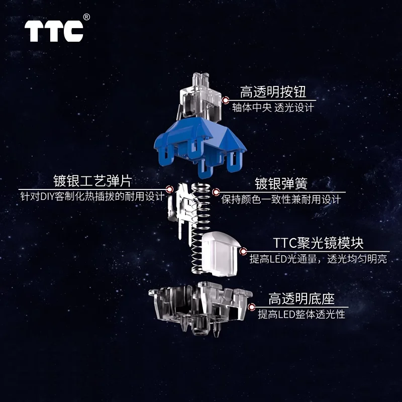 Los últimos interruptores mecánicos TTC Neptune y Venus están diseñados con los diseños originales de estructura de riel patentado por TTC.Esto incluye un resorte largo, construcción similar a un Lego, lo que garantiza una escritura de calidad con un gatillo suave y un rebote rápido.
