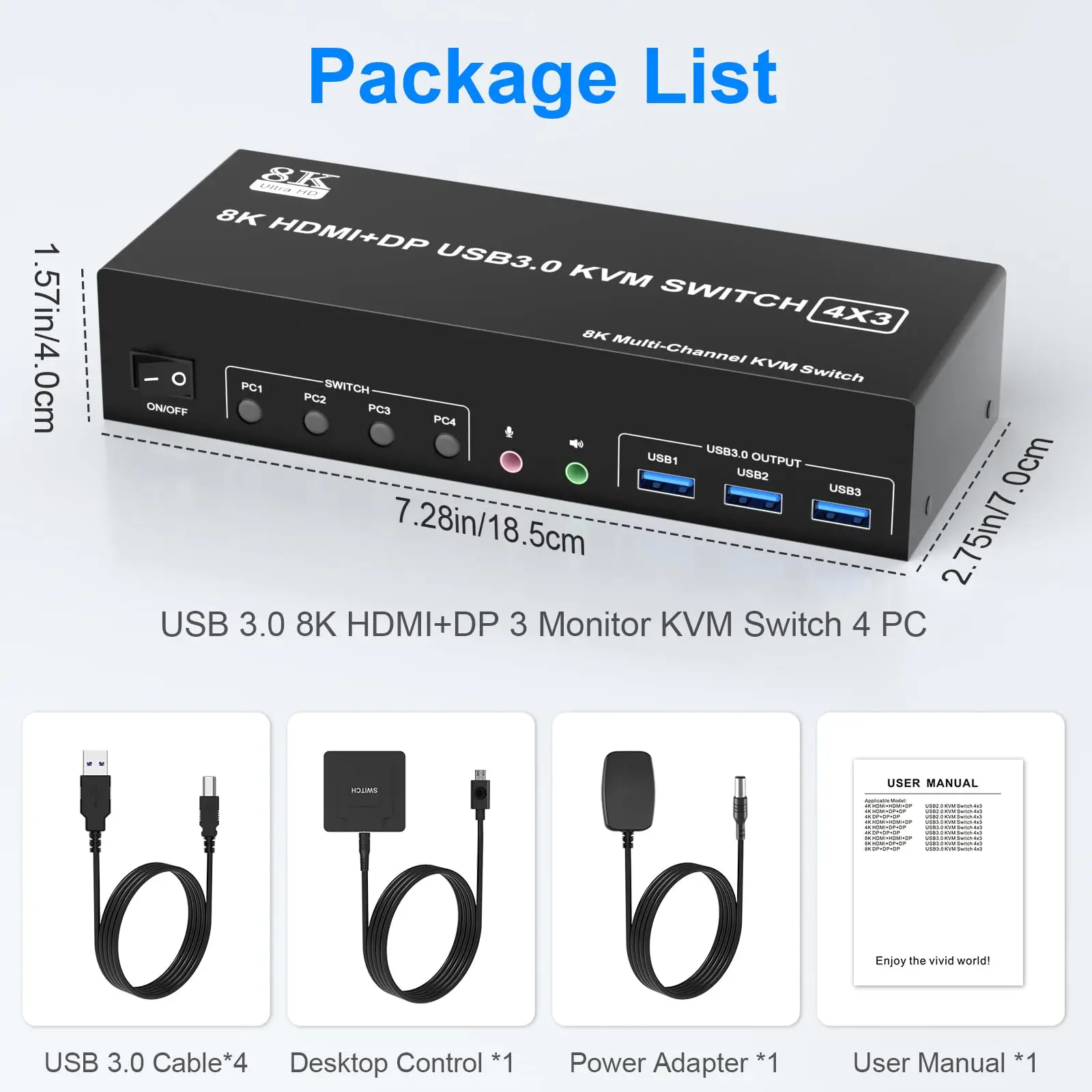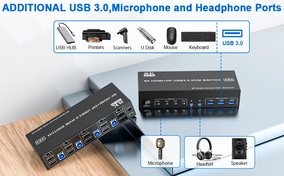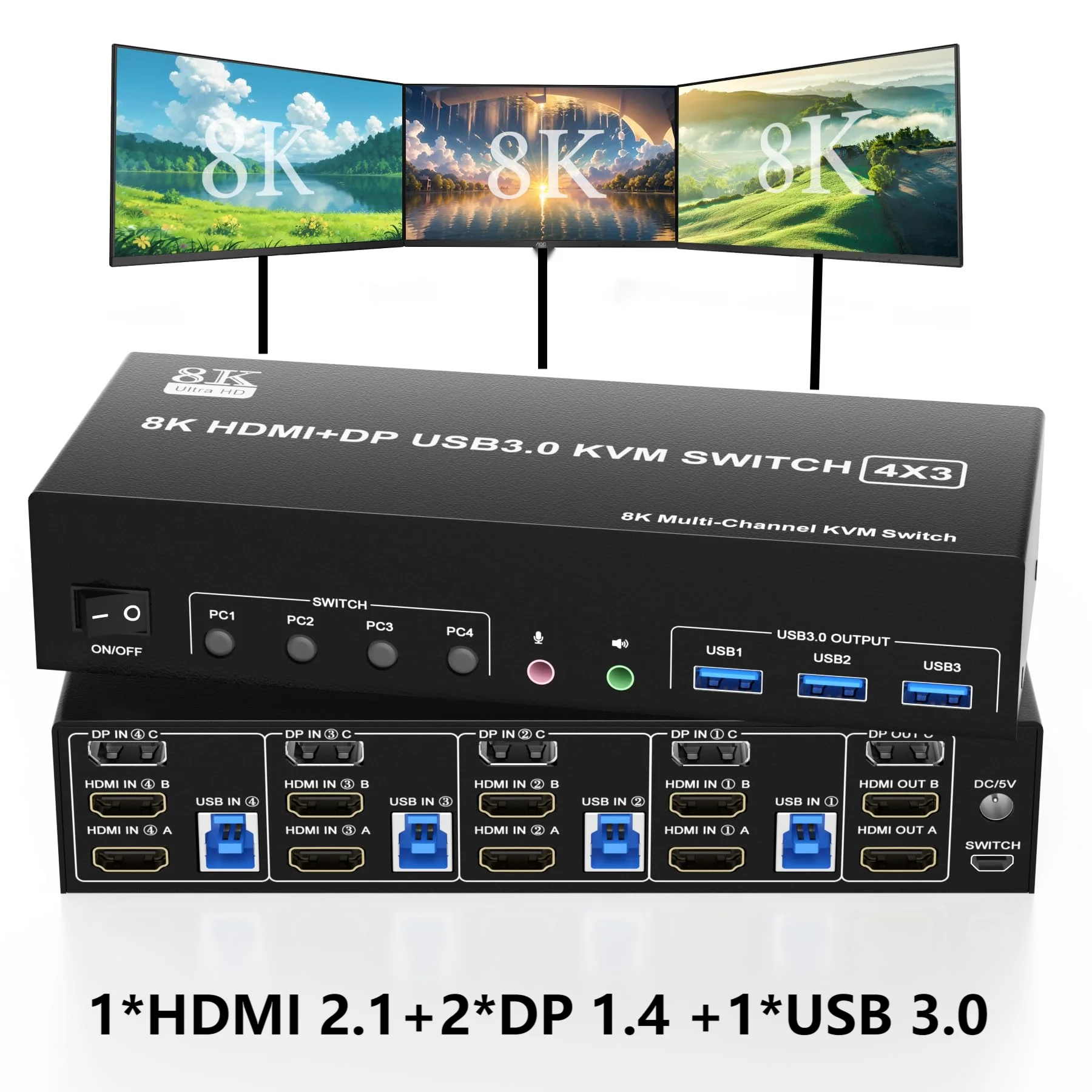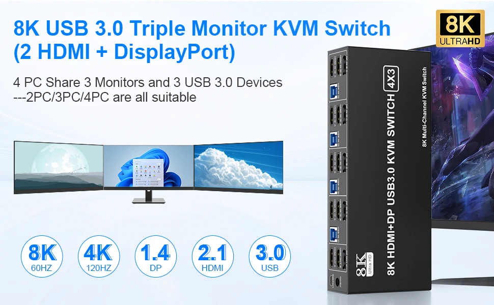 8K 60Hz 4x3 2 canales HDMI + 1 canal Displayport USB 3,0 KVM Switch le permite compartir un teclado USB, ratón USB, y dos monitores HDMI y un monitor DP para controlar 4 ordenadores, portátiles y consolas de juegos.
