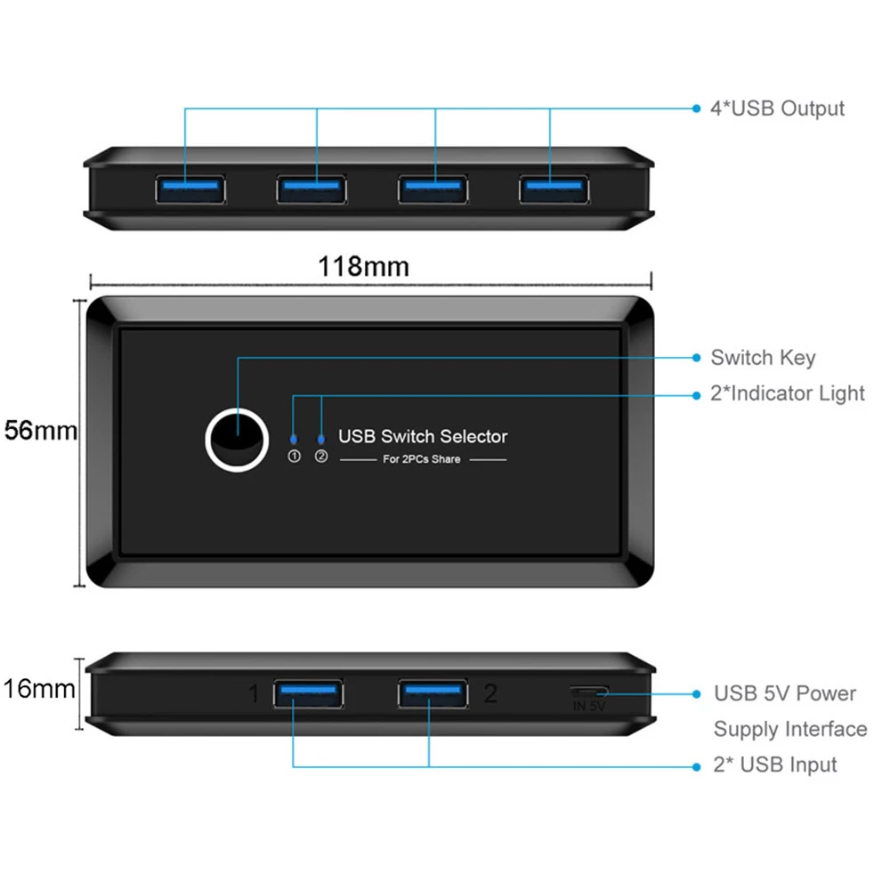 Características:. USB 3,0: utiliza la interfaz USB 3,0 para hacer la transmisión de datos más rápida.. Dos ordenadores comparten un dispositivo USB: dos ordenadores comparten una impresora, botón, ratón, unidad flash USB, etc., evitando enchufar y desenchufar con frecuencia, que es conveniente para el trabajo y no daña el dispositivo. Dos ordenadores comparten cuatro dispositivos USB.. Los dispositivos USB como 2 entradas USB y 4 salidas USB teclados, ratones, impresoras USB, escáneres, trazadores de curvas, impresoras multifunción, dispositivos Bluetooth, etc. se pueden utilizar con 2 ordenadores, ahorrando dinero y tiempo.. Los dispositivos como los puertos de Alimentación de 5V CC, los discos duros y las cámaras digitales pueden requerir alimentación externa para funcionar. Cuando Use dispositivos de alta potencia, asegúrese de usar un adaptador estándar de 5V para la fuente de alimentación.. Amplia compatibilidad: Compatible USB con la mayoría de dispositivos, como teclado/ratón/impresora USB/escáner/lector de unidad USB/disco duro, adecuado para Plug and Play en Windows 10/8.1/7/Vista/XP y para Mac OS X, para Linux y para Chrome OS.Especificaciones:Nombre del producto: Interruptor USB 3,0Modo de operación: llaveEntrada de alimentación: USB 5VLongitud de la línea: 1,5 (M)Puerto de entrada: 2 * USBPuerto de salida: 4 * USBColor del producto: negroMaterial del producto: plásticoTamaño del producto: 56*118*16MMEl paquete incluye1 * interruptor USB2 * Cable USB1 * Manual de usuario