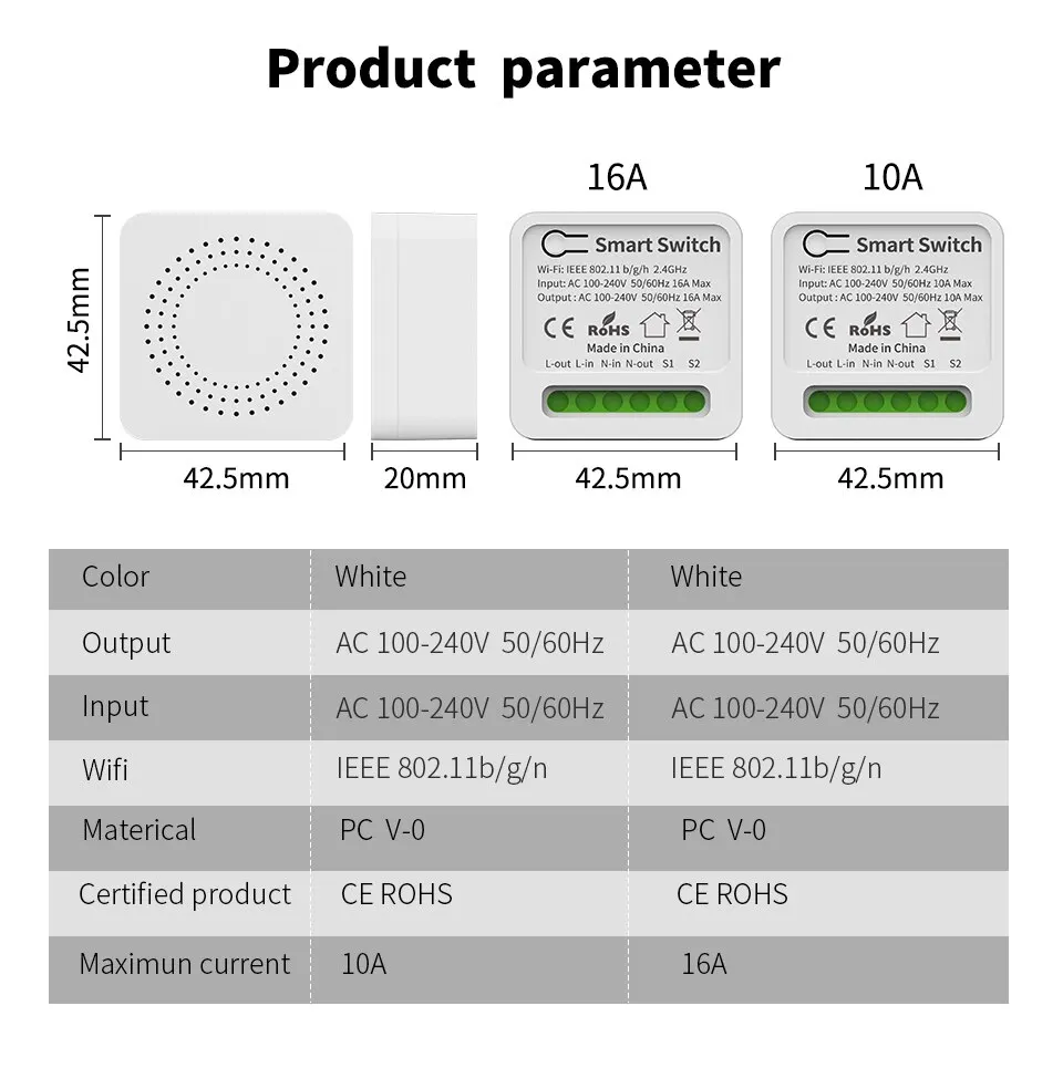Tuya WiFi mini interruptor inteligente 16A interruptores DIY de 2 vías módulo temporizador compatible con Alexa Google Home Alice control de voz vida inteligente