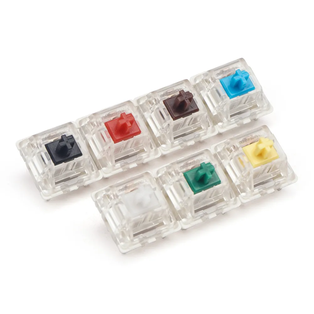 2. Black:swith-Linear 55g, Red:switch-Linear 45g, Brown:switch-Tactile 45g,Blue:switch-Clicky 55g, Green: switch-Clicky 80g, Yellow: switch-Linear 50g, White: switch-Linear 35g