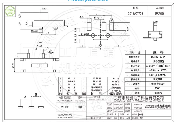 Comprar Interruptores de palanca de piezas, 10 MSK-12C01, 7P, parche vertical, siete pies