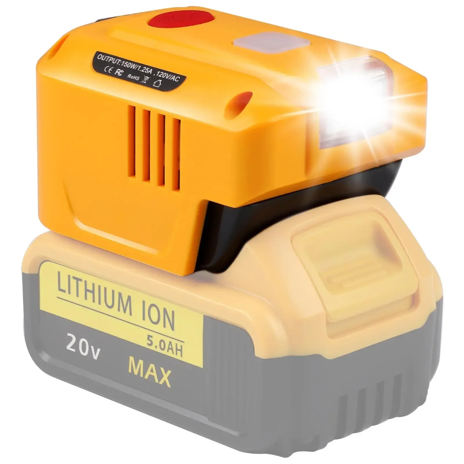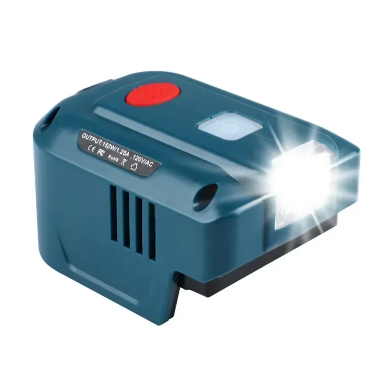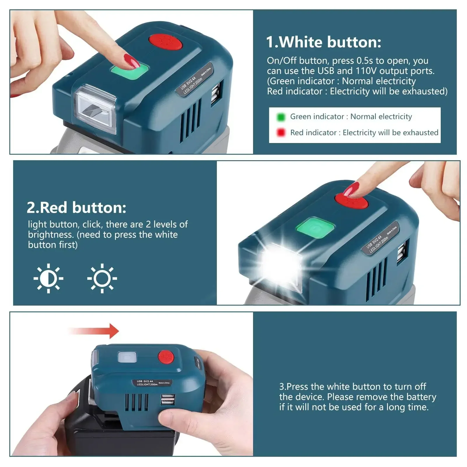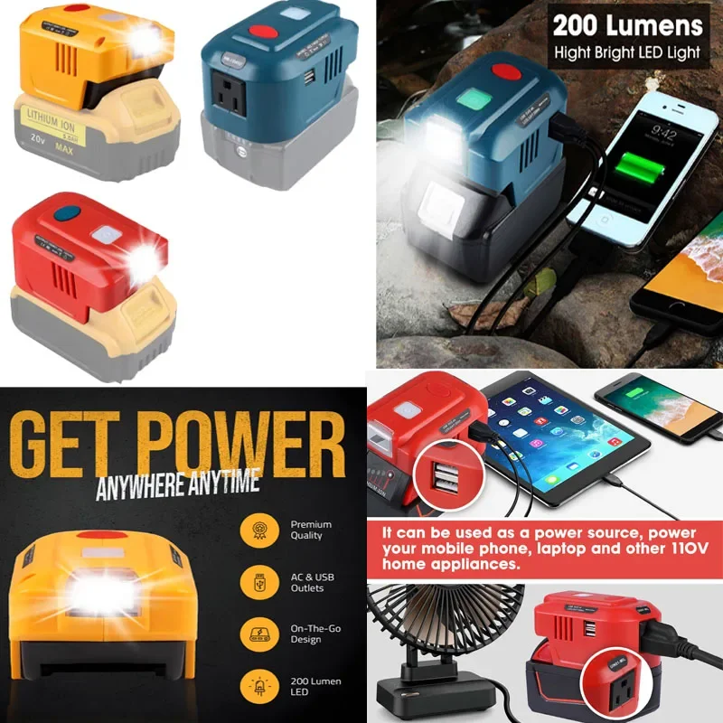 El inversor de batería de iones de litio convierte el cargador inversor portátil USB dual de CC a CA para Makita/Devault/Milwaukee 18 V 110 ~ 120 V 150 W Descripción: *Este producto es un inversor de batería de litio, que puede convertir corriente continua en corriente alterna con salida estable. *Los escenarios aplicables son acampar y salir para trabajar al aire libre. *Lo más difícil en las salidas de camping al aire libre es cargar los pequeños electrodomésticos que traes.Este producto resuelve el mayor problema de las salidas de camping.Carga al aire libre. * El USB dual puede cargar sus dos teléfonos móviles al mismo tiempo, el diseño del enchufe del inversor puede cargar su computadora portátil, maquinilla de afeitar, luces, pequeños ventiladores, etc.