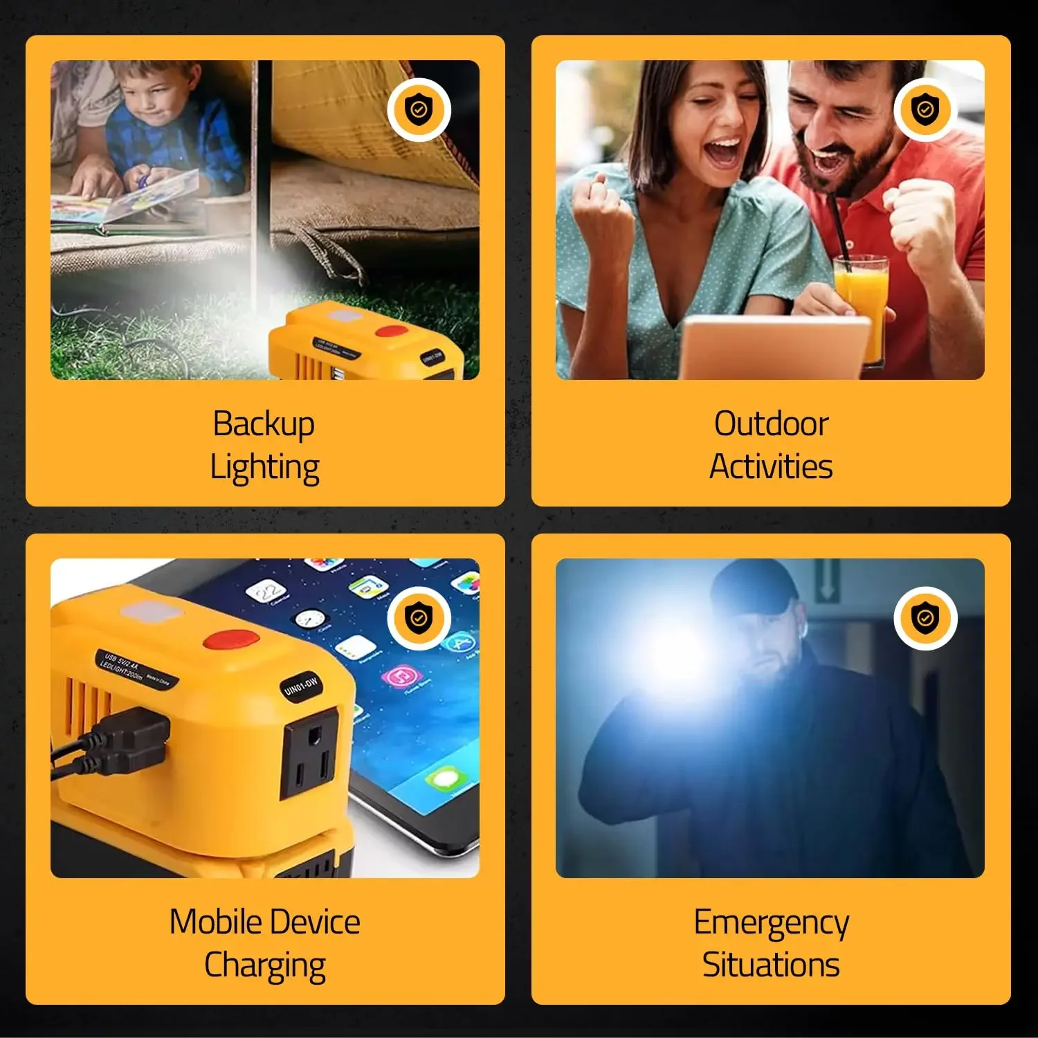 Característica: 110 V-120 V (enchufe estadounidense), 220 V (enchufe europeo), 150W, 1,25A. Pequeños aparatos electrónicos compatibles, como teléfonos móviles, tabletas, computadoras portátiles, radios, pequeños ventiladores y luces LED, etc. 18V a110 V-120 V (enchufe estadounidense), 220 V (enchufe europeo)