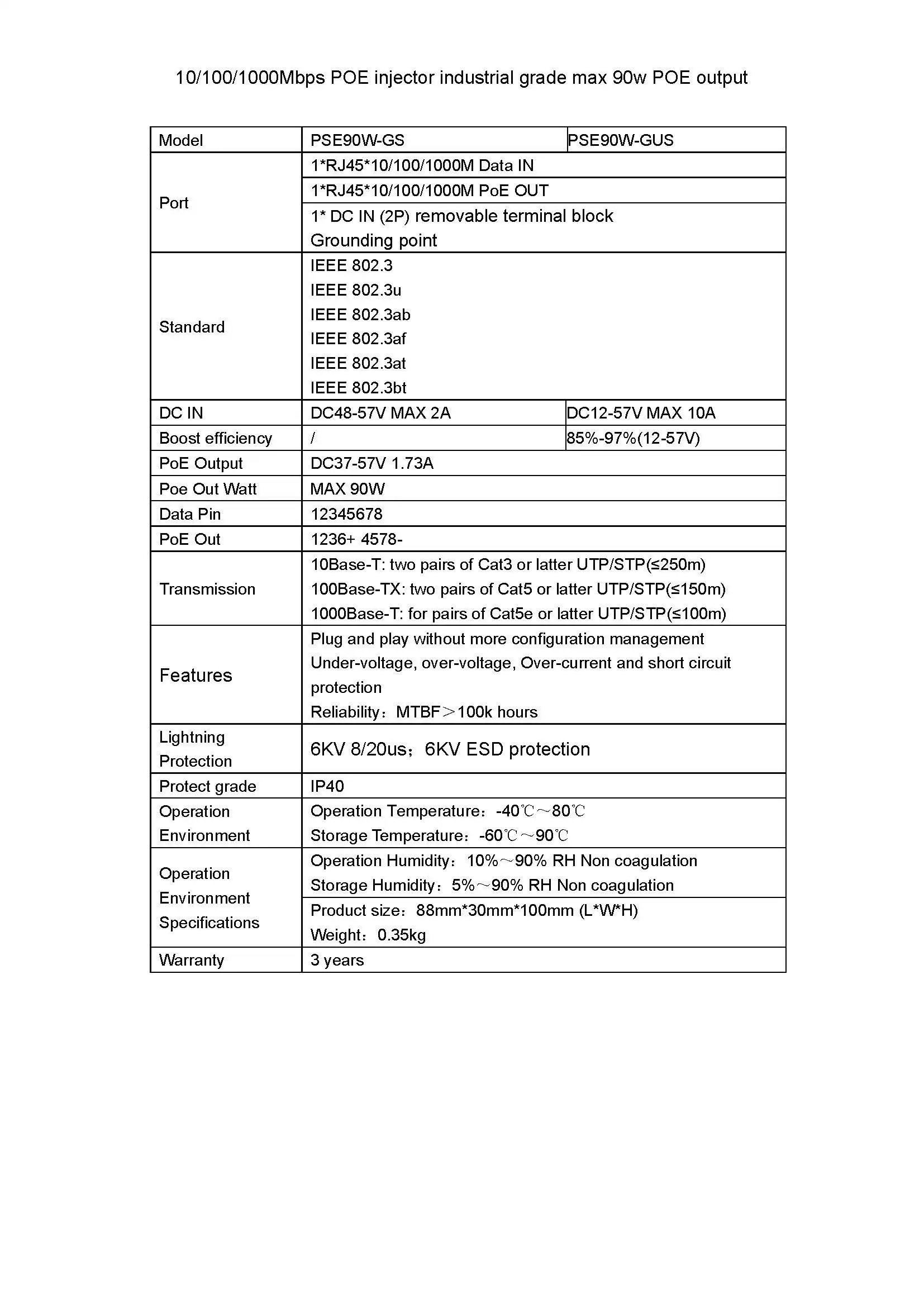 1.: admite Entrada de 48-57V CC y salida POE activa de 90W;