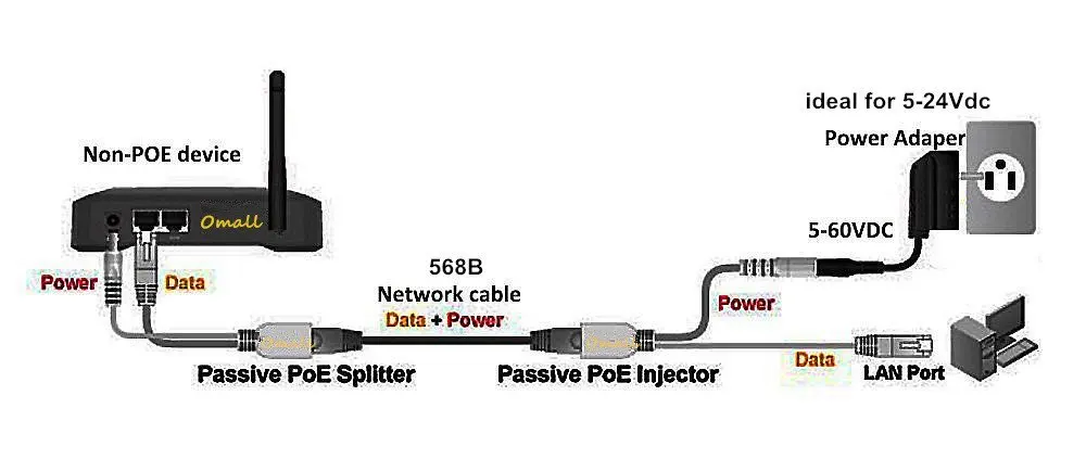 El conjunto completo de potencia pasiva sobre Ethernet contiene dos piezas: inyector y divisor. Es adecuado para productos que básicamente no son compatibles con Power over Ethernet. El conjunto pasivo de alimentación a través de Ethernet es aplicable a una amplia gama de productos de red como puntos de acceso, enrutadores, cámaras IP, módems, conmutadores, ordenadores integrados u otros dispositivos de red. La potencia pasiva a través de Ethernet SET es compatible con la mayoría de los dispositivos disponibles en el mercado, como D-Link, Linksys, Airlive, Senao, Wline, Micronet, Edimax, etc. Los dispositivos se pueden suministrar de forma estándar hasta 50V. (El adaptador de corriente no está incluido-es posible utilizar el adaptador de corriente del dispositivo alimentado como punto de acceso, cámara IP, etc.) el rango de PoE pasivo normalmente es de 30-40 metros/100-130 pies (la distancia real depende de la fuente de alimentación, el tipo de cable y el dispositivo alimentado).