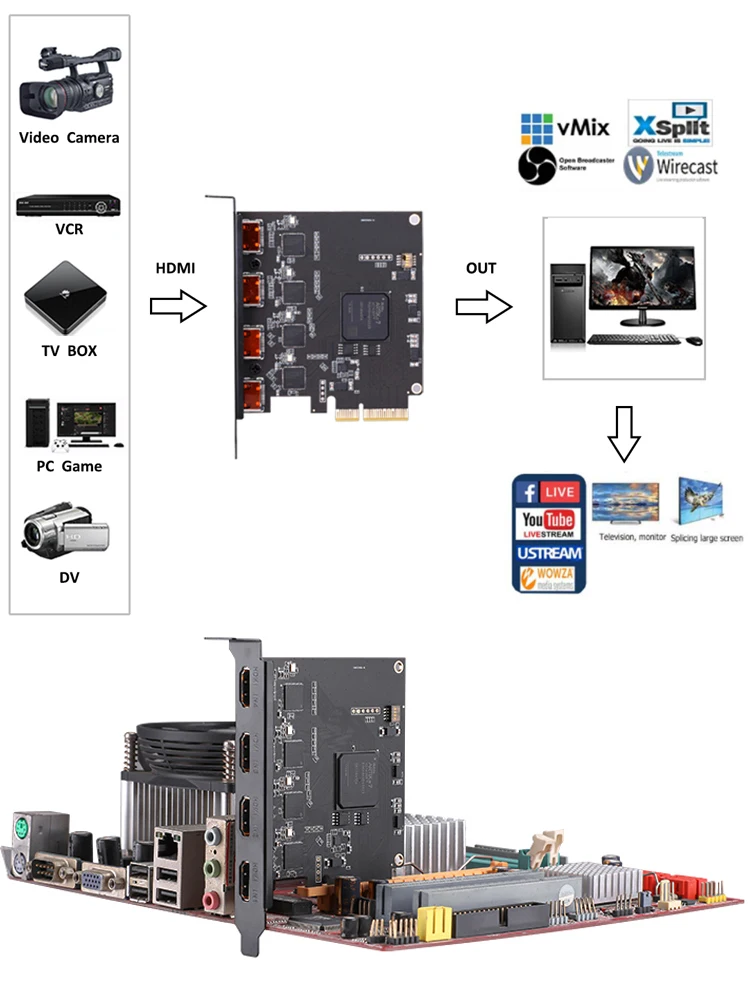 HDMI Recorder es una tarjeta PCIe de alto rendimiento que le permite capturar desde 4 fuentes HDMI diferentes en cualquier combinación de formatos de computadora SD, HD, Ultra HD, 4K e incluso al mismo tiempo.Con 4 conexiones de entrada HDMI 2.0b independientes.