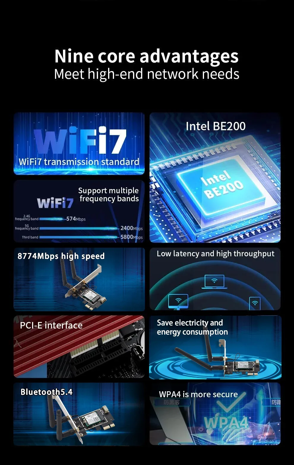 Tarjeta de red WiFi 7 Intel BE200 PCI-E Bluetooth 5,4 Tri Band 2,4G, 5G y 6GHz 8774Mbps BE200NGW Chip 802.11be Adaptador PCIe inalámbrico