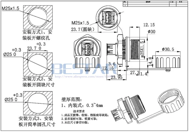 Nota: se trata de una rosca métrica M25x1,5 que se puede instalar en la placa del chasis cuyo espesor de pared sea inferior a 5 mm.