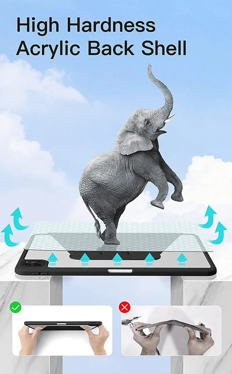 Smart Cover para dormir/despertar automáticamente: el respaldo duro transparente y liviano ofrece una excelente protección contra daños y rayones y la funda de cuero Smart PU activa automáticamente su tableta cuando se abre y la pone en suspensión cuando está cerrada.Diseño de hebilla magnética, puede almacenar su lápiz de segunda aplicación y carga y emparejamiento inalámbricos