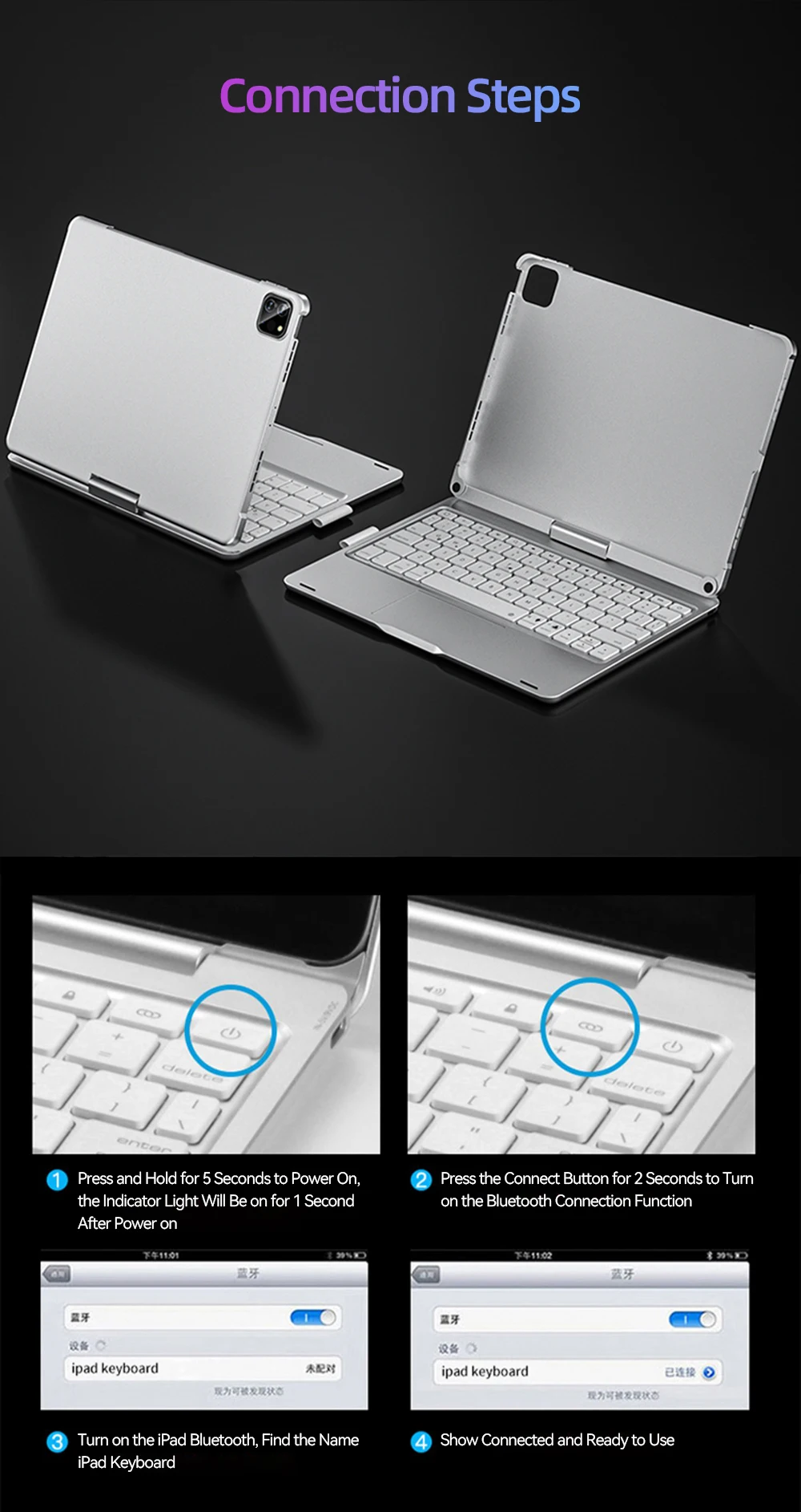 3.Encienda el iPad Bluetooth, busque el nombre del teclado del iPad.