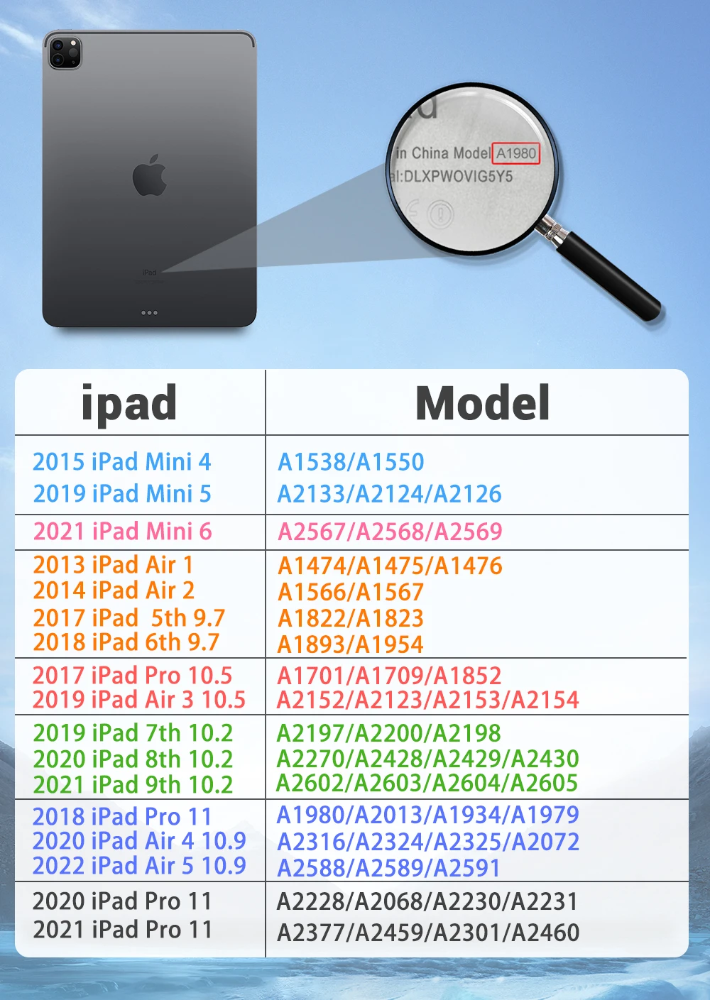 Verifique el número de modelo de su iPad antes de comprar.Está ubicado en la parte posterior del iPad, número de modelo: A ****.Si hay algún problema con el producto, comuníquese con nuestro servicio de atención al cliente.Gracias