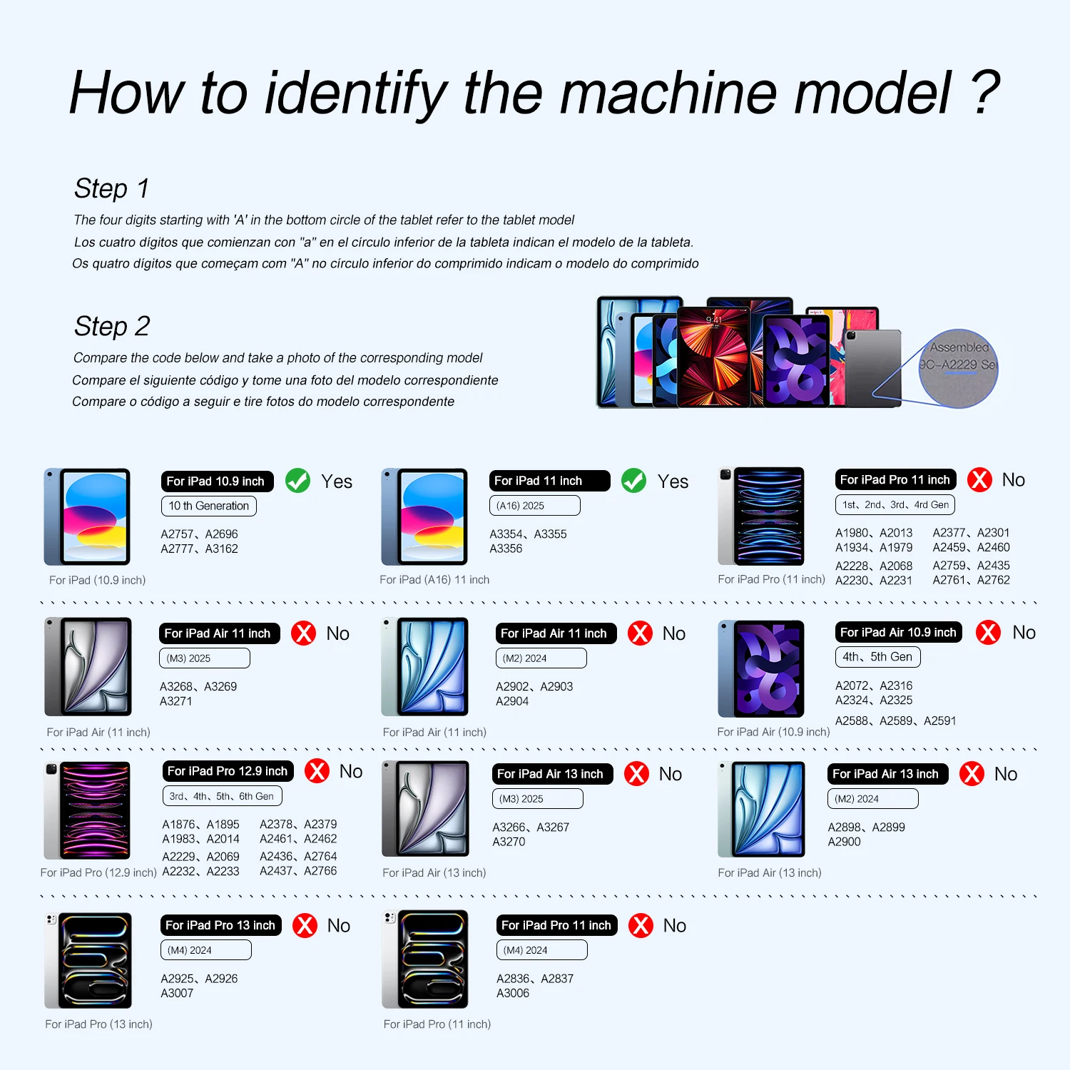 Nota: Estos dos modelos de funda para teclado son universales,No compatible con otros modelos。Si la etiqueta del modelo en la caja de embalaje del producto que recibió indica iPad 10 o iPad A16, es correcta y no se envía incorrectamente.