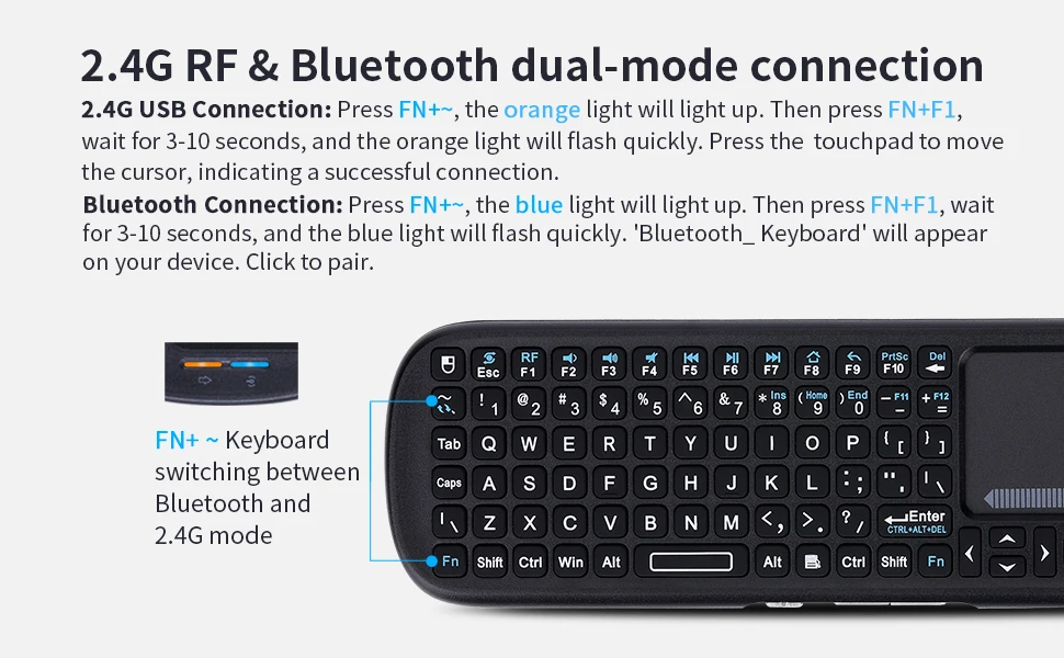 1.Presione FN+~ para cambiar de modo: luz naranja para wifi, azul para bluetooth