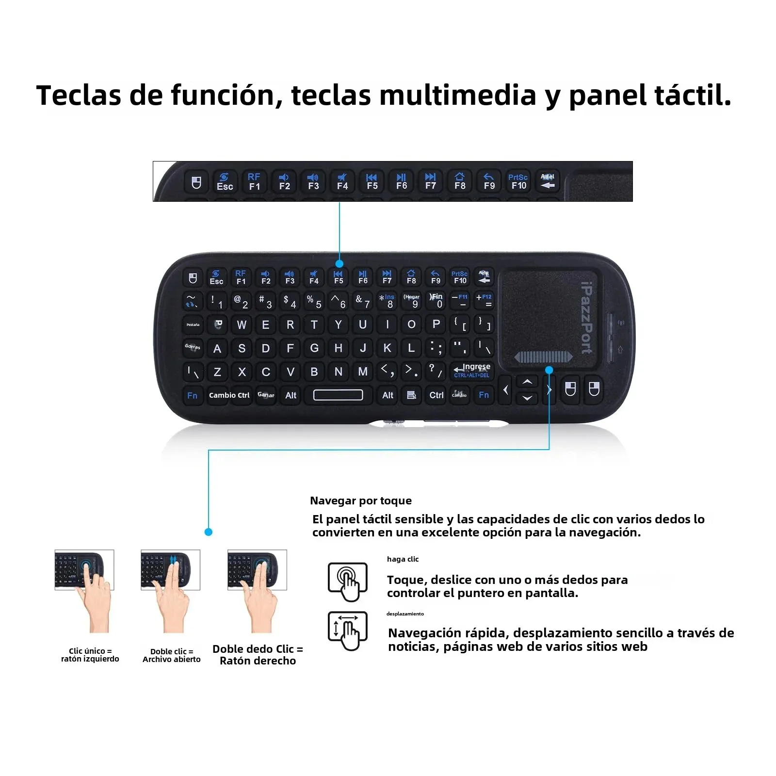 3.[Placa táctil sensible y teclas de acceso rápido] El panel táctil puede controlar con precisión el dispositivo a través de gestos con múltiples dedos y agrega un área dedicada adicional para desplazar páginas hacia arriba y hacia abajo, teclas de acceso rápido multimedia, control remoto, navegación/escribir/copiar/pegar, jugar, mirar películas y comprar son más convenientes.
