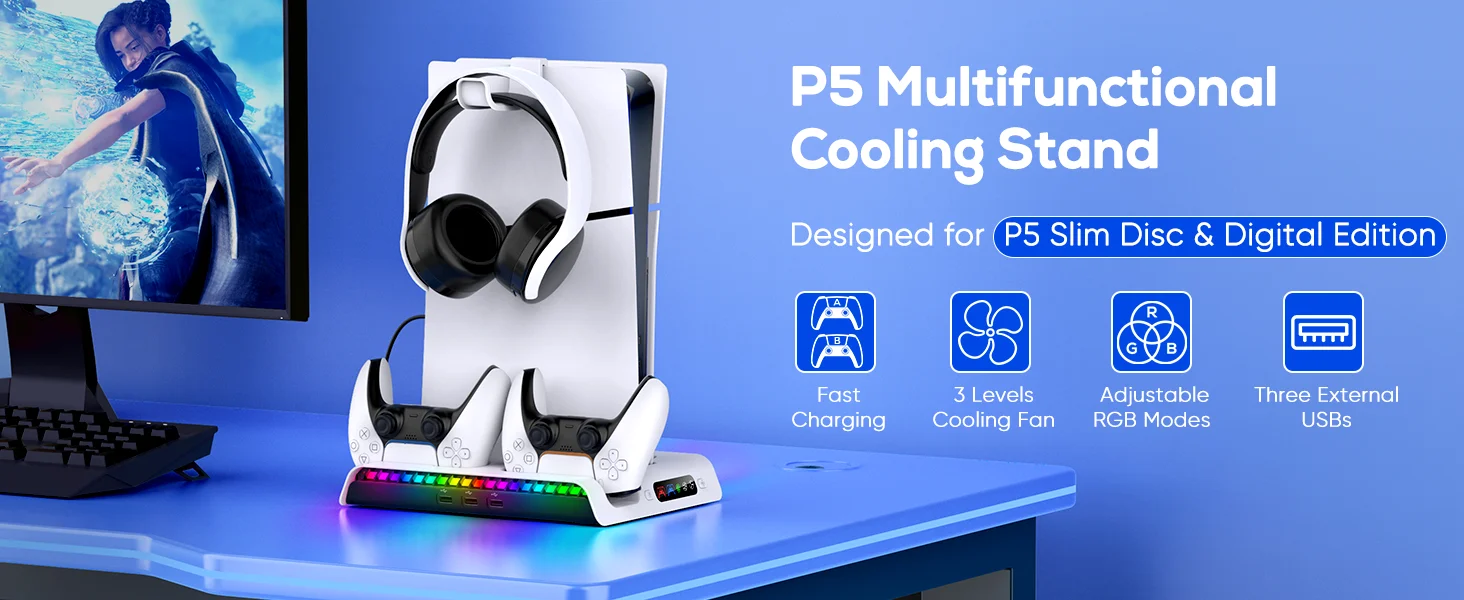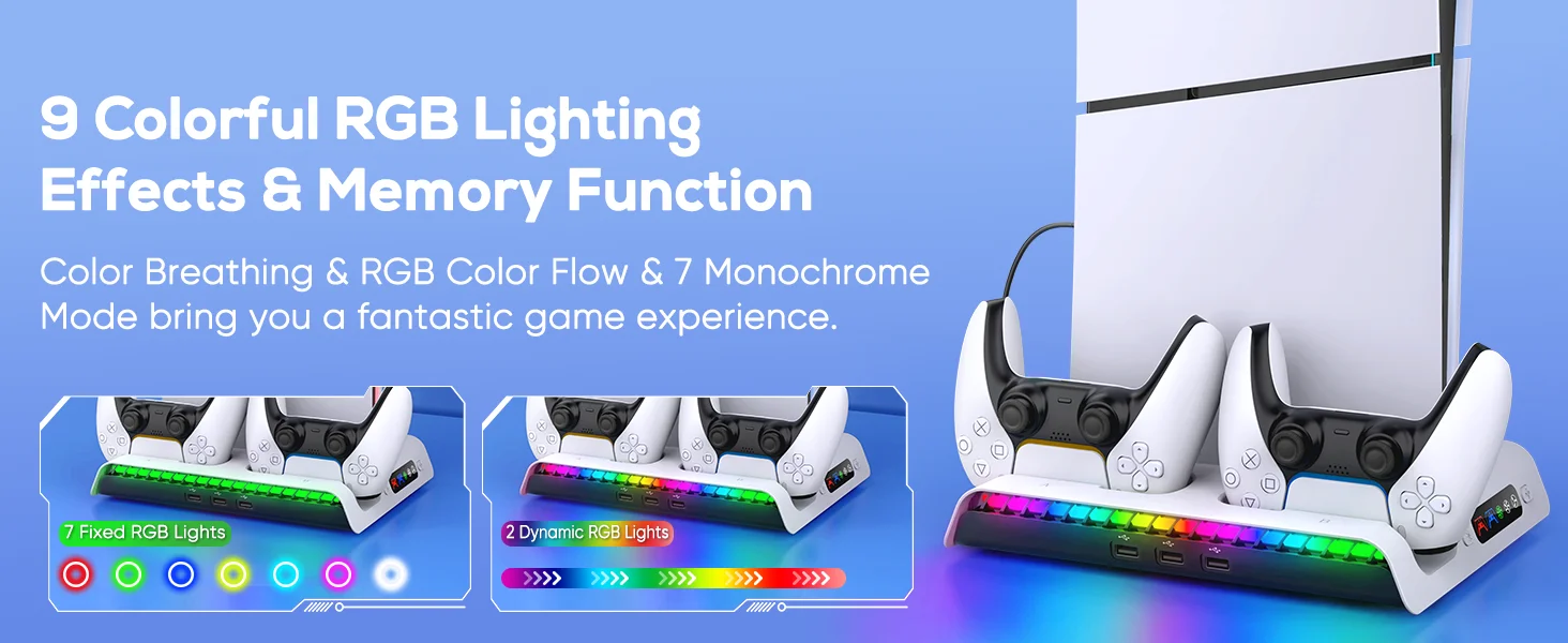 Comprar IPEGA-soporte de carga con ventilador de refrigeración para consola PS5 Slim Digital/Disc, controlador Dual con 9 luces RGB, PG-P5S006