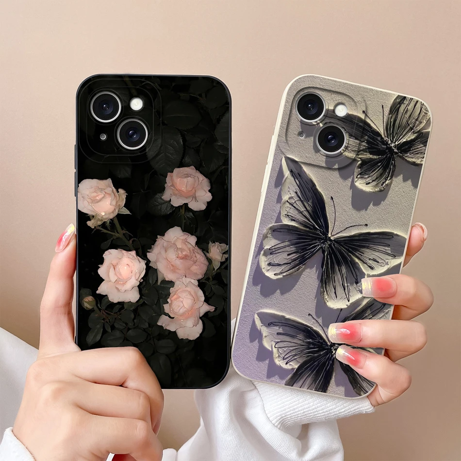 Comprar Para iPhone 15 Plus Pro Max funda de teléfono Rosa-mariposa protección completa contraportada para iPhone15 15Pro 15 + parachoques anticaída suave
