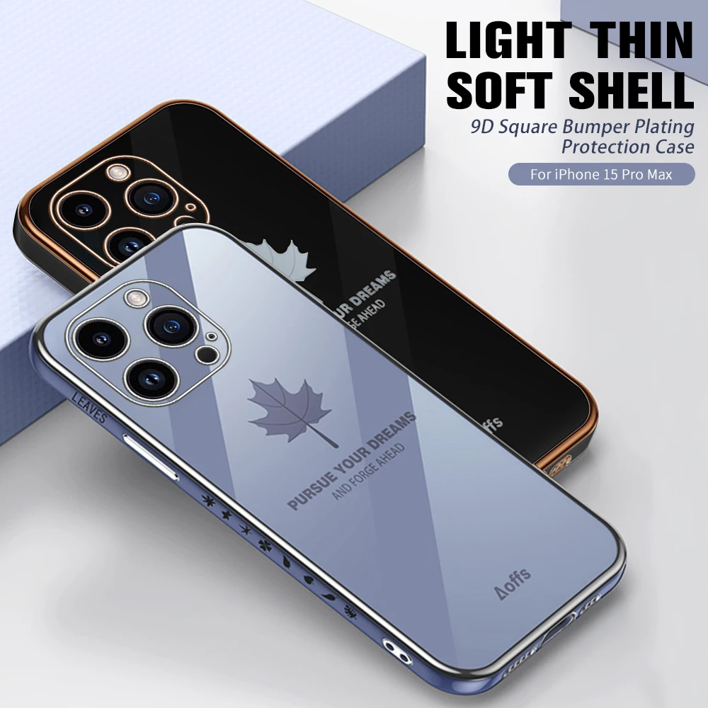 Comprar Iphone 15 Pro Max Plus funda con cordón, cubierta suave de TPU, hoja de arce chapada, 5G, protección de cámara