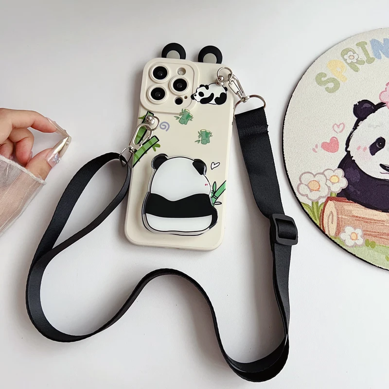 Para iPhone 17 16 15 14 13 12 11 XR Xs 6 6s 7 8 SE Pro Max mini Plus e orejas Panda funda con cuerda de soporte