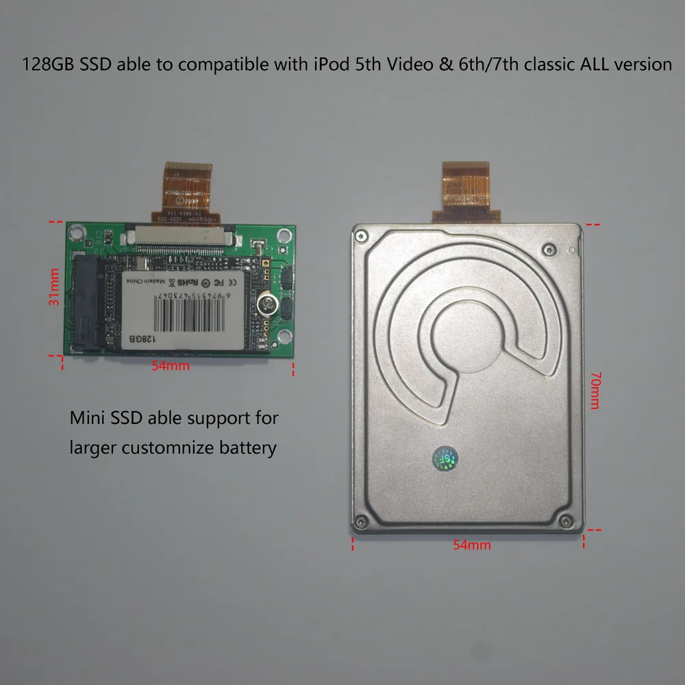 Compatible para:iPod 5o vídeo todas las versiones (30 GB/60 GB/80 GB)iPod 6th/7o clásico todas las versiones.(80GB/120GB/160GB)Reemplazo MK3008GAL/MK6008GAH/MK8010GAH/MK8022GAA/MK1231GAL/MK1626GCB/MK1634GAL en iPodEl paquete contiene:1.1 Uds. Mini SSD CE de 1,8" y 128GB de repuesto para iPod 5o vídeo/6o y 7o iPod clásico2.1 par de herramientas(Para calor abstracto, el SSD no necesita espuma azul alrededor del disco duro para protegerlo)Comprar Para iPod video classic 128GB 1,8 "Mini SSD reemplazar original MK3008GAL MK8010GAH MK8022GAA MK1231GAL MK1626GCB MK1634GAL actualización