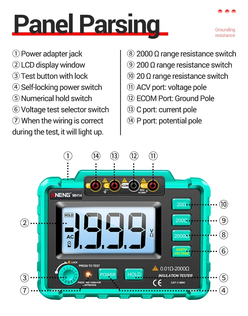 ANENG MH14, digital megohmmeter, insulation resistance tester, 20Ω, 200Ω,2000Ω,AC200V,1999 counts, digital display, ground resistance meter, electrical testing tool, multimeter accessories, high voltage tester, professional megger, insulation tester, electrical equipment testing#Insulation Tester #Megohmmeter #ANENG #MH14 #Electrician Tools#Resistance Tester #2000Ω #CATIII #DIY Tools #Safety Rated