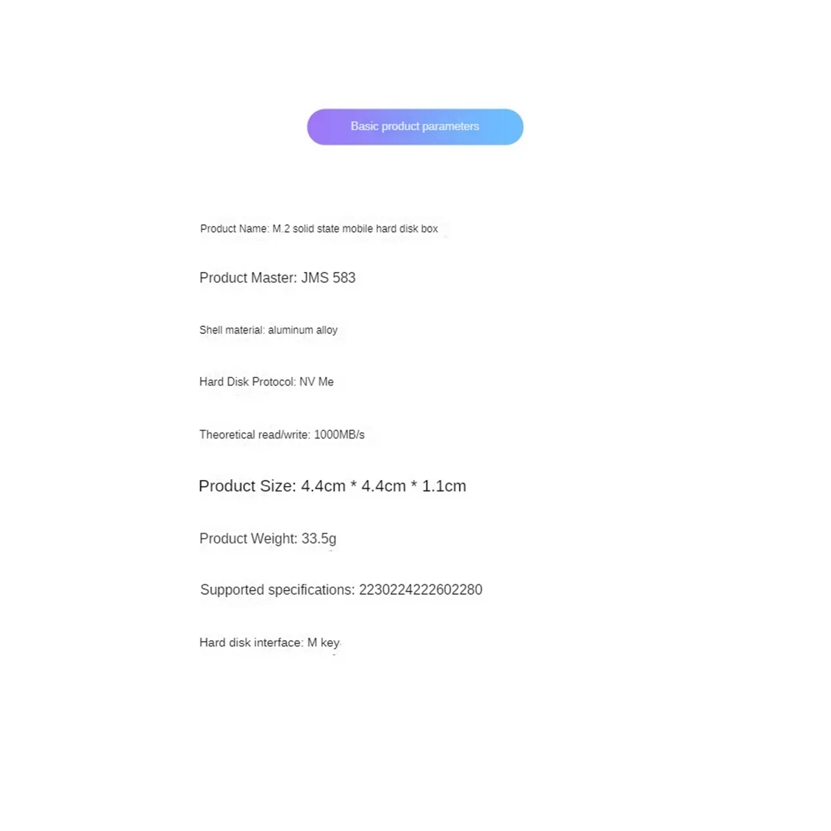 1 * Caja SSD 1 * Cable USB A a USB C Solo el contenido del paquete anterior, otros productos no están incluidos. Nota: El reflejo de la luz y las diferentes pantallas pueden hacer que el color del elemento en la imagen sea un poco diferente del real. El error de medición permitido es +/- 1-3cm.