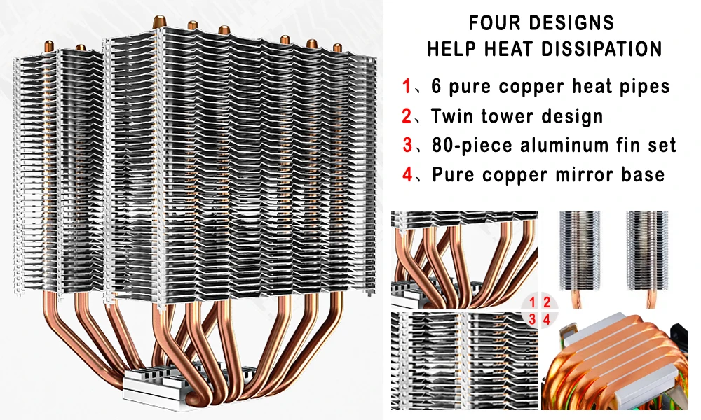En circunstancias normales, 6 tubos de cobre del disipador térmico de la cpu pueden enfriar eficazmente la temperatura de la cpu en 10-15 grados Celsius.