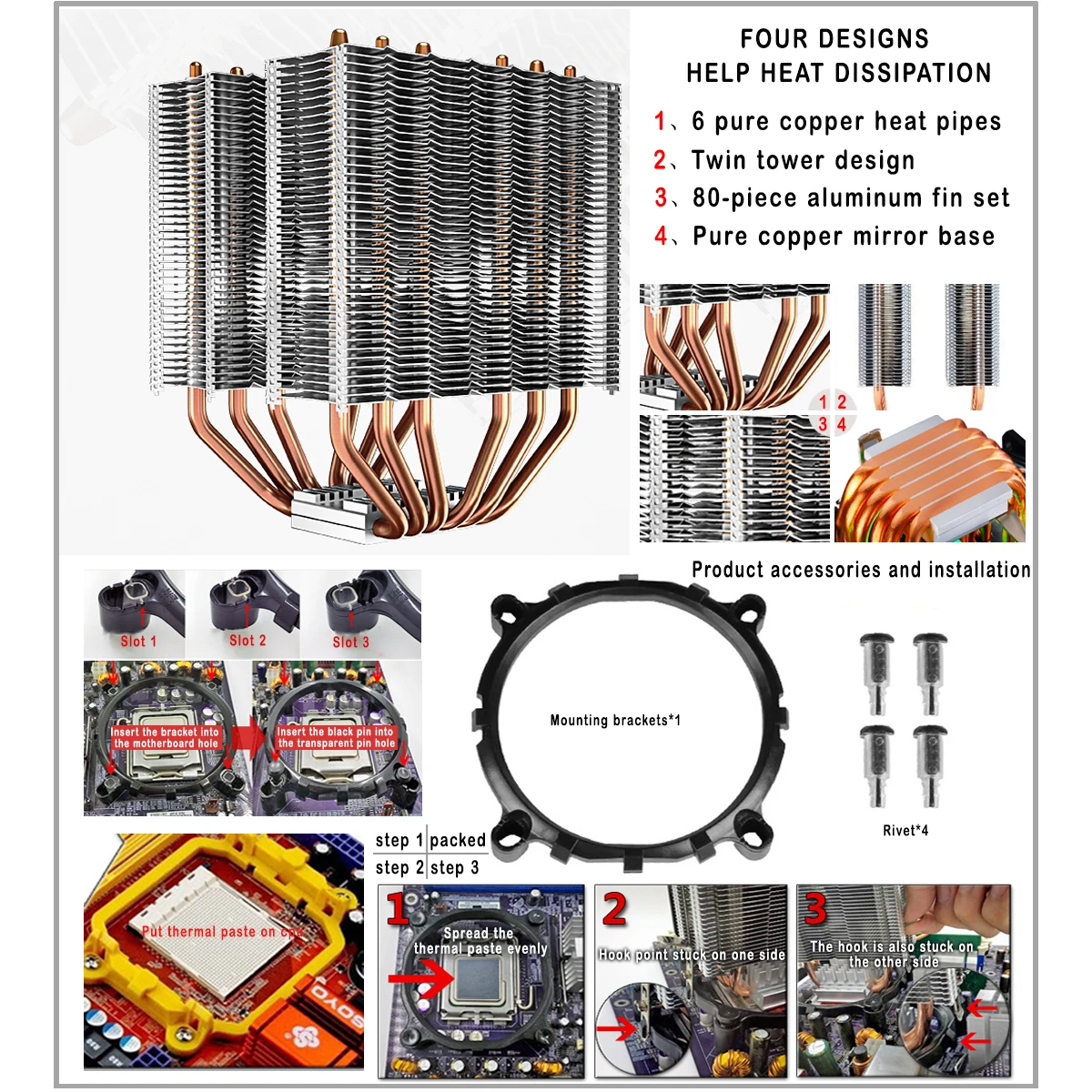 En circunstancias normales, 6 tubos de cobre del disipador térmico de la cpu pueden enfriar eficazmente la temperatura de la cpu en 10-15 grados Celsius.