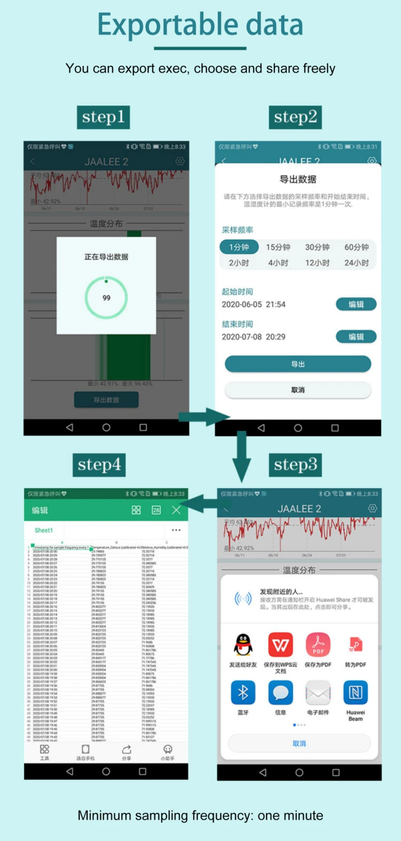 1. El termohigrómetro se puede utilizar solo. La distancia abierta es de 100 metros. En el caso de obstrucción, la distancia se reduce considerablemente. El teléfono móvil no necesita estar junto con el termohigrómetro. El termohigrómetro puede almacenar datos durante 20 días cuando graba una vez por minuto.. El medidor de temperatura y humedad generalmente almacena datos por sí mismo. Después de conectarse al teléfono móvil a través de, cargue los datos almacenados en el teléfono móvil. Los datos se pueden ver en el teléfono móvil, exportar a Excel, Y el PDF se puede enviar al ordenador usando el teléfono móvil (el teléfono móvil no necesita realizar un seguimiento del termómetro). Ponerlos juntos).