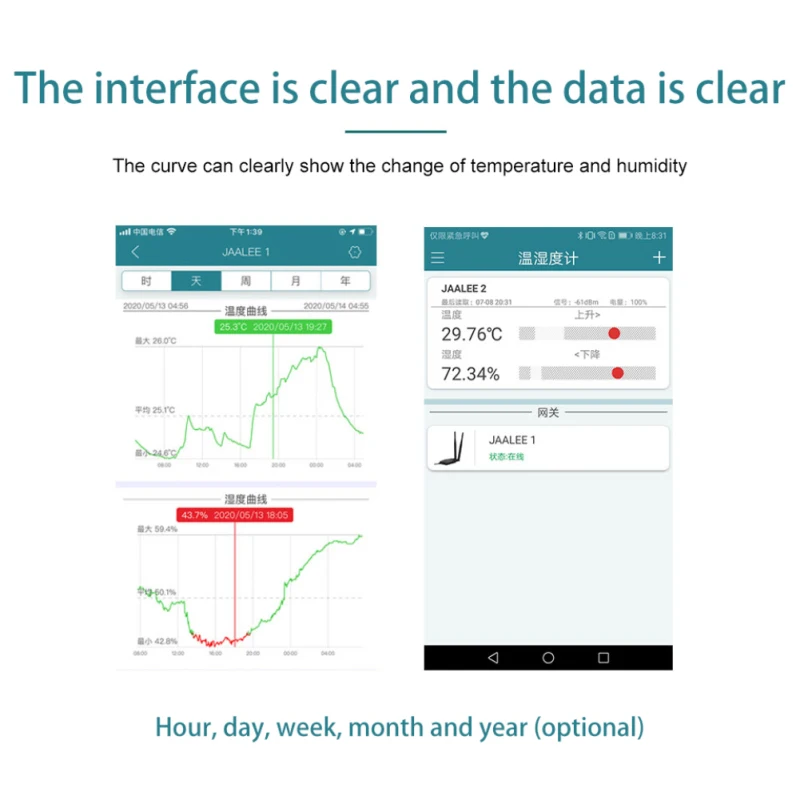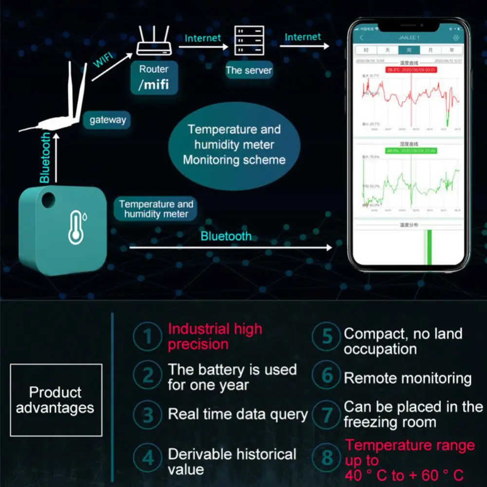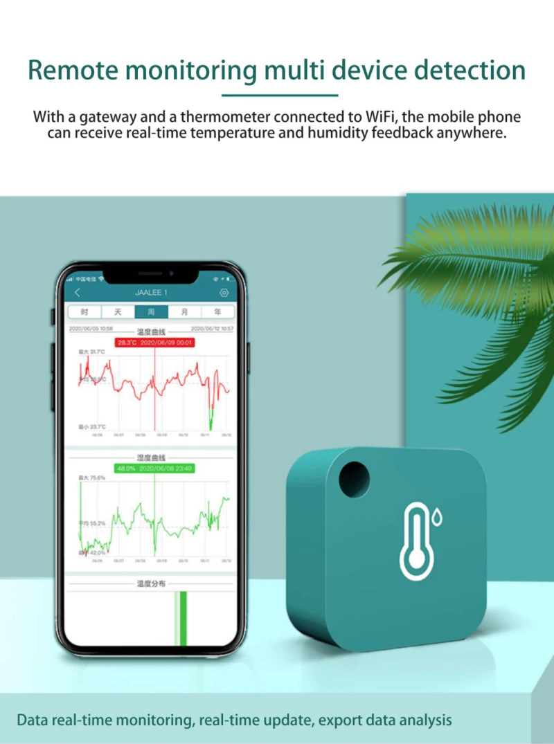 Con la puerta de enlace, el medidor de temperatura y humedad está conectado a WiFi, y el teléfono móvil puede recibir información en tiempo real de la temperatura y la humedad en cualquier lugar.