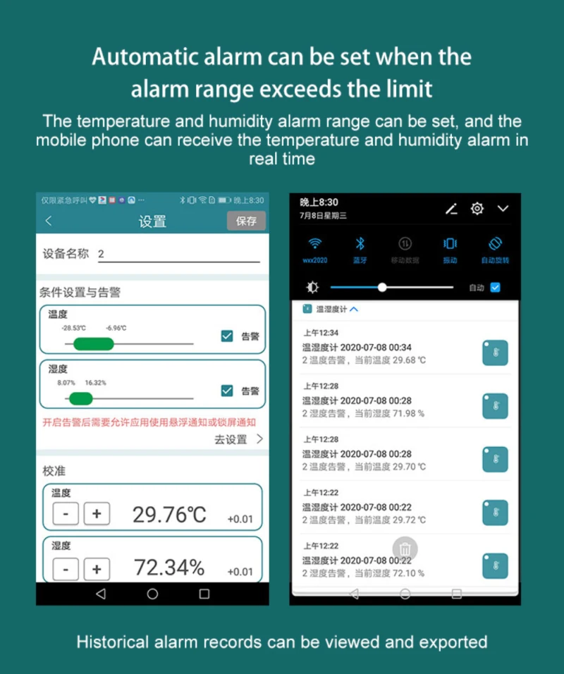 Se puede establecer el rango de alarma de temperatura y humedad, y el teléfono móvil puede recibir de forma remota la alarma de temperatura y humedad superior en tiempo real.