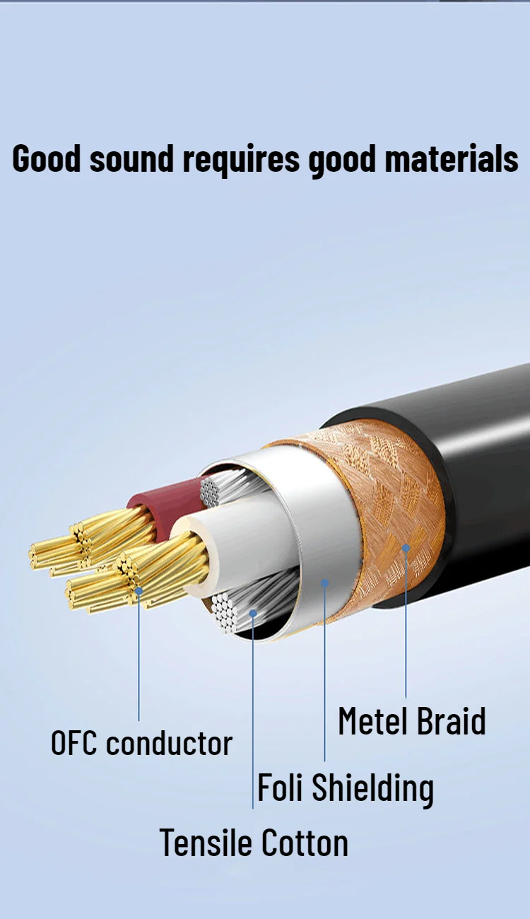 - Conductor de cobre libre de oxígeno con aislamiento, lámina y relleno con algodón elástico se combinan para proporcionar una transmisión de señal precisa y sin ruido.
