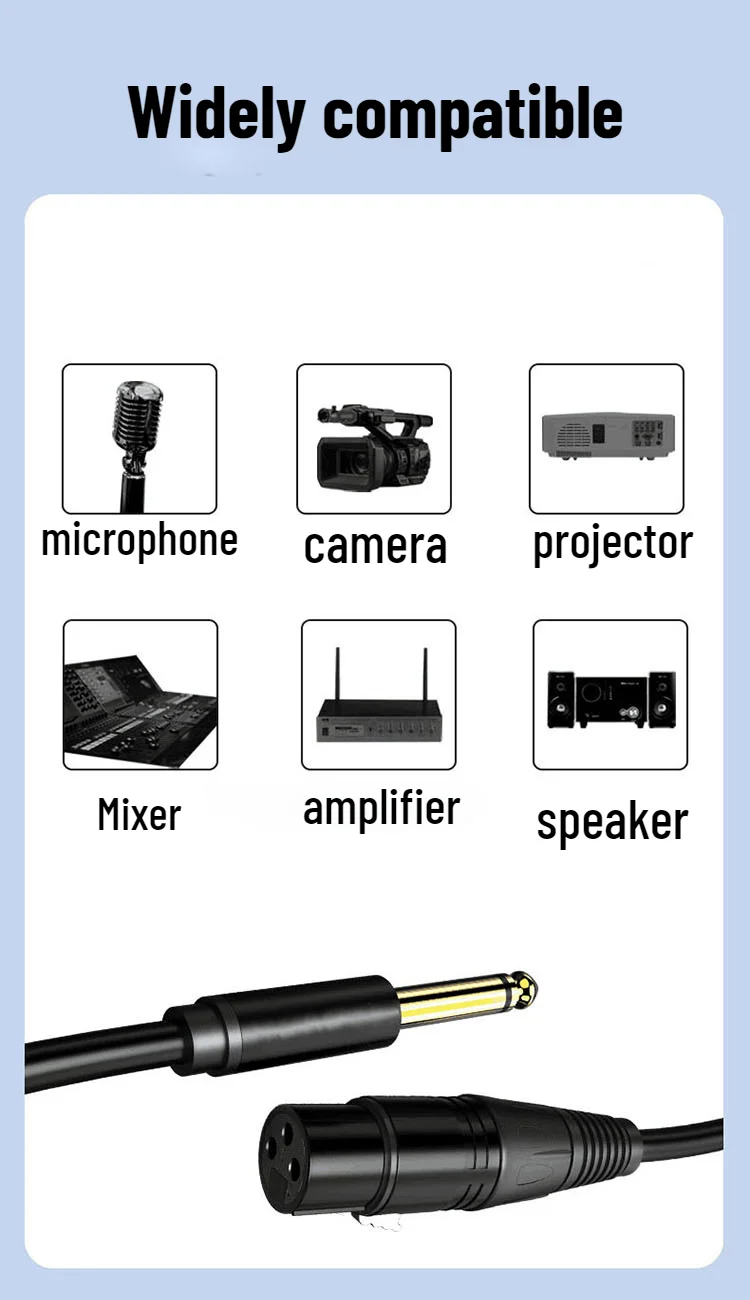 Adecuado para equipos con XLR de 3 pines a 6.35 mm como micrófonos dinámicos, sistemas de altavoces, micrófonos de escopeta, consolas de sonido de audio, armonizadores de estudio, tableros de mezclas, amplificadores de potencia, lotes de conexión, sistemas estéreo, preamplificadores, sonido y escenario en vivo y otros.Ampliamente utilizado en salas, escenarios, clubes, KTV, cine en casa y más.