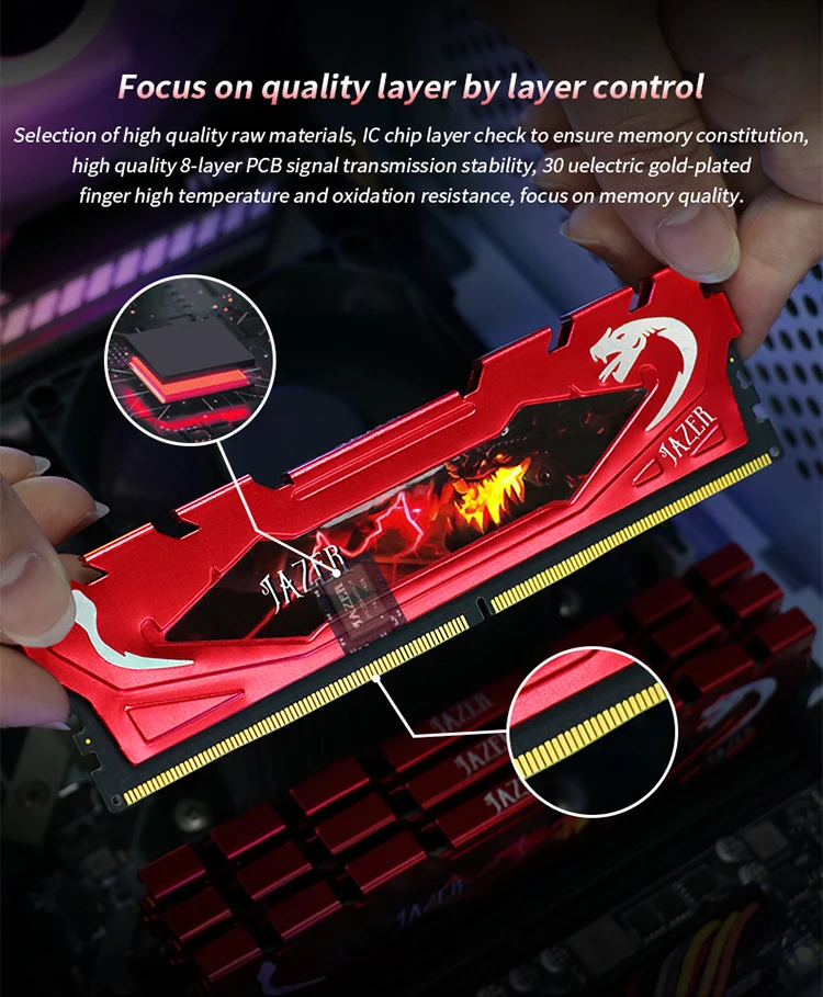 2. Utiliza partículas JAZER rigurosamente probadas, compatibles con una amplia gama de ordenadores, también compatibles con plataformas Intel y AMD. (Por ejemplo: Samsung, Hynix, Micron, magnesio, Asia del Sur Yisheng, Elpida)