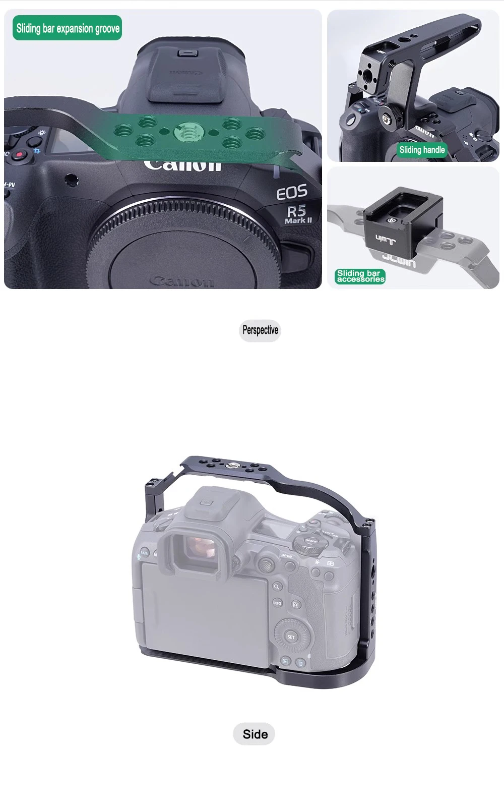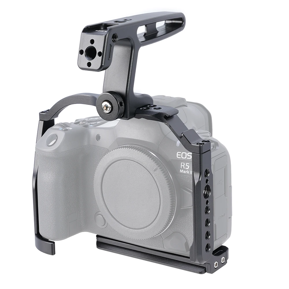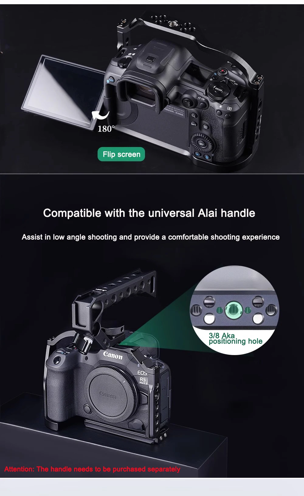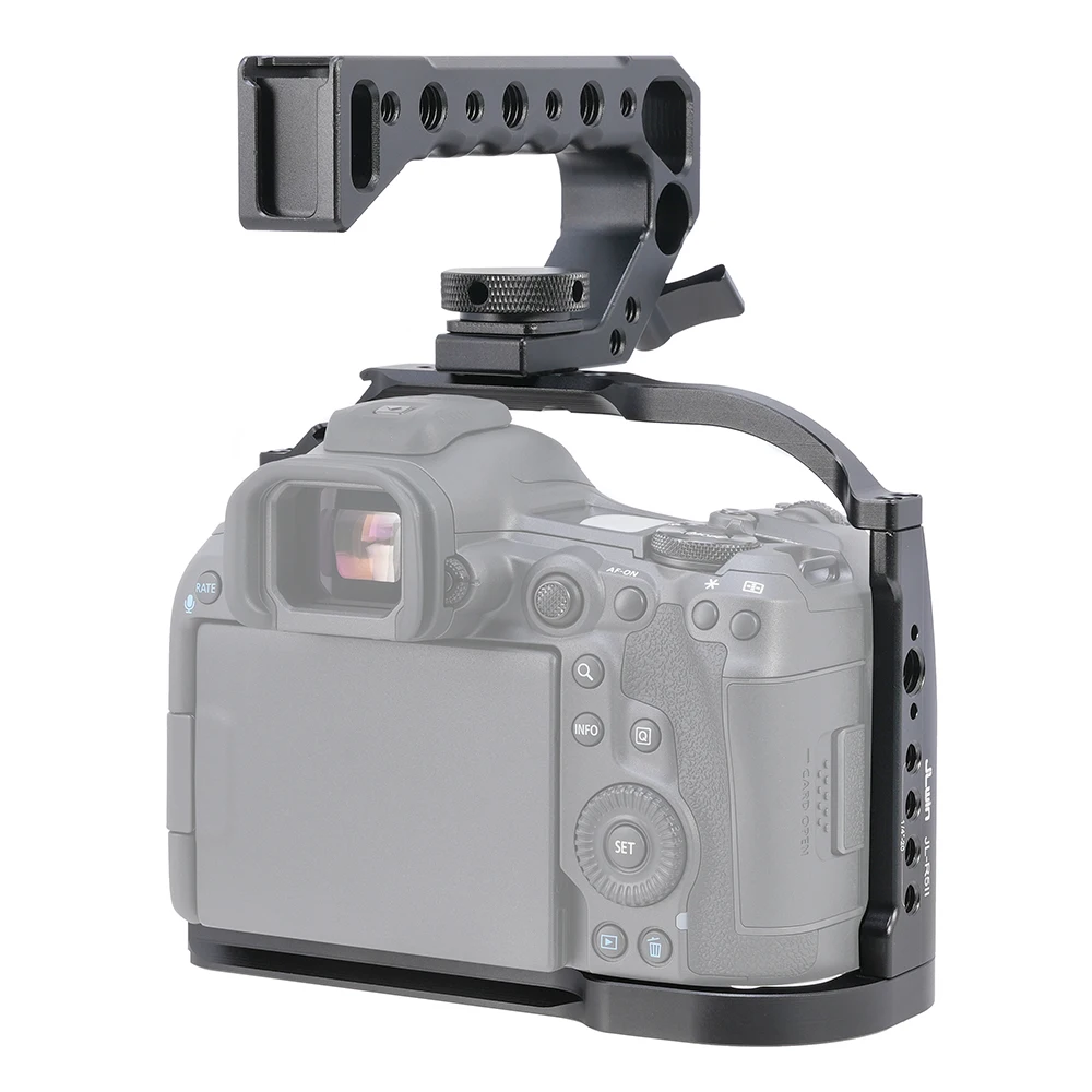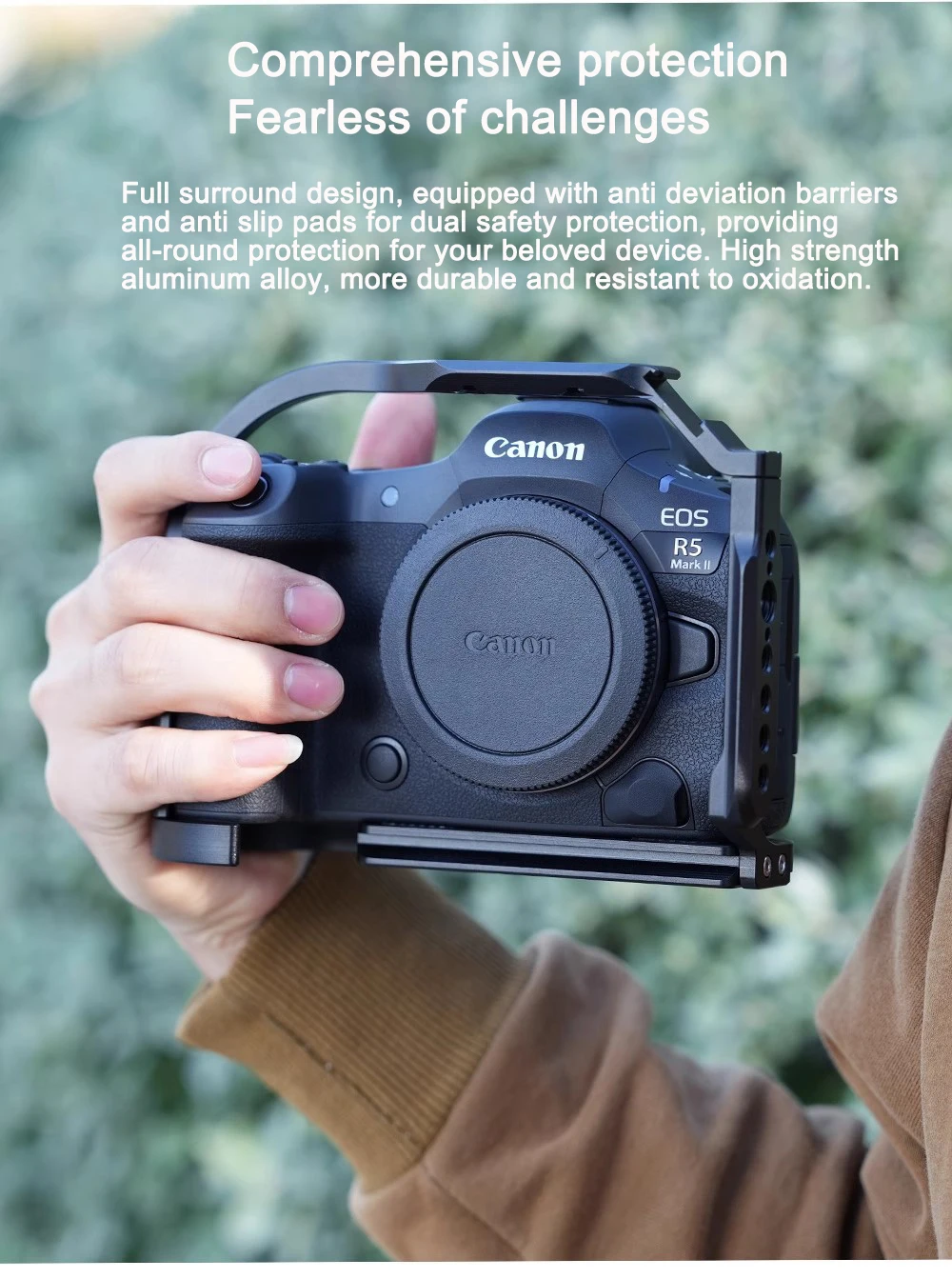 Descripción:La jaula de aluminio para cámara está diseñada específicamente para Canon EOS R5 Mark II Cámara.Es una jaula completa que es liviana y se adapta perfectamente a la cámara.Está equipado con múltiples orificios roscados de 1/4" -20 y 3/8" -16, orificio de ubicación ARRl y zapata fría para montaje de accesorios.