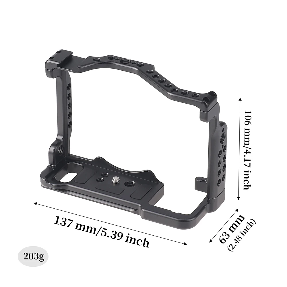 Description:Aluminum Camera Cage is specifically designed for Sony A7RV Camera. It is a full cage which is lightweight and perfectly form-fitting the camera. It is equipped with multiple 1/4" -20 and 3/8" -16 threaded holes, ARRl locating hole and cold shoe for accessories mounting.Features:1. It is made of aeronautical aluminum and CNC precision machining. It is robust and durable, light and easy to use;2. Lightweight cavity design, a large number of 1/4" -20 & 3/8" -16 threaded holes, ARRl locating hole and a bulit-in cold shoe mount for microphone, LED lights or the monitor bracket mounting.3. The bottom of the cage has anti-slip pads and anti-deflection design to protect the camera from scratching and movement. It also built in 1/4" -20 screw holes on the bottom to attach the camera to tripod.4. The bottom is 38mm wide sliding international standard for Arca-style plate design, which can be quickly installed on tripod ballhead compatiable with Arca Swiss Standard.5. It would not block any buttons and interfaces of the camera or the installation of the battery, and providing different DIY possibilities for the camera accessories attaching.Specification:Material: Aluminum alloyProcessing technology: CNC machiningSurface treatment: AnodizingSize:137*106*63mm(L*H*W)Net weight: 203gPackage include:Different packages have different product lists