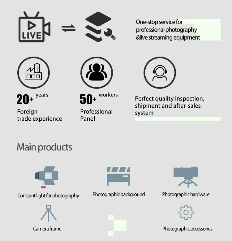 1) P: ¿Por qué elegirnos?R: Brindamos servicios integrales para fotografía profesional y equipos de transmisión en vivo.Con más de 20 años de experiencia en comercio exterior, un equipo de ventas profesional y un completo sistema de inspección de calidad, envío y posventa.
