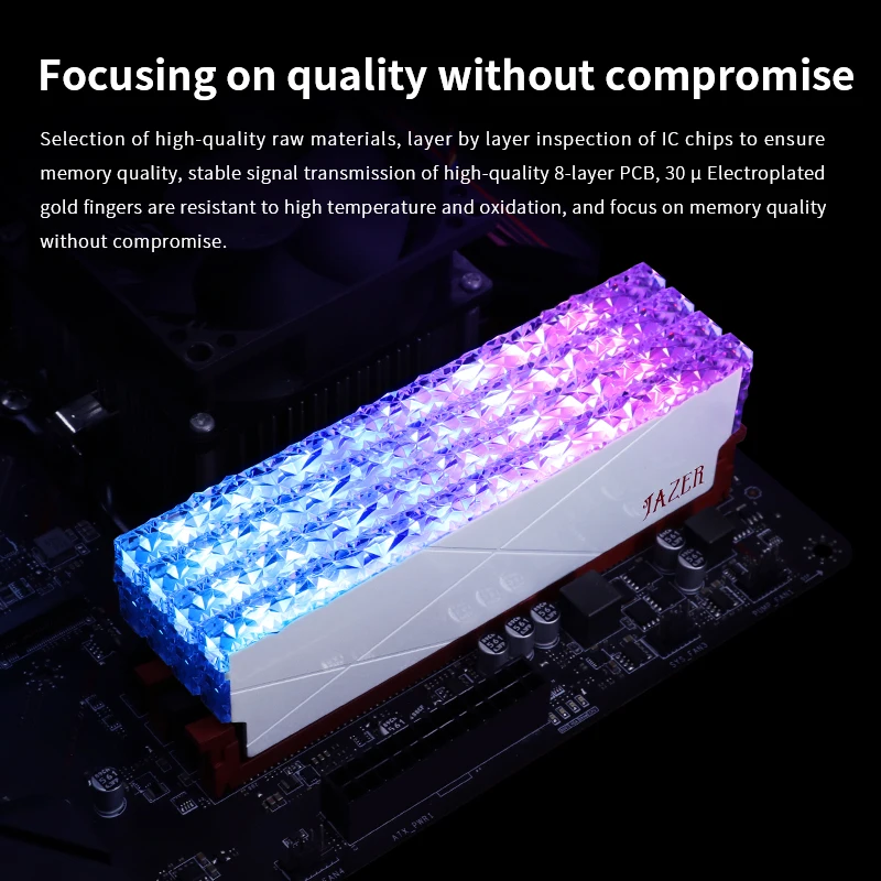 • Alta Frecuencia de memoria:Con una frecuencia de memoria de 3600MHz, El JAZER RGB RAM DDR4 8GB 16GB de memoria garantiza un rendimiento suave y tiempos de respuesta rápidos.