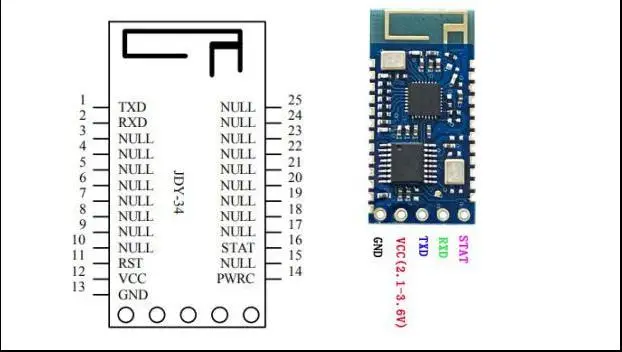 Parámetros del productoModelo: JDY-34Tipo de antena: antena integrada PCBFrecuencia de trabajo: 2,4GPotencia de transmisión: 4db (máximo)Interfaz de comunicación: UARTVoltaje de funcionamiento: 2,1 V-3,6 VTemperatura de trabajo: -40 ℃-80 ℃Sensibilidad de recepción: -91dBmDistancia de transmisión: 40 metrosTamaño del módulo: 27*12,88*1,8mmVersión compatible con Bluetooth: BLE 4,2 + modo dual SPP (compatible hacia abajo con 4,2, 4,0, 3,0, 2,1, 2,0)Velocidad de transmisión transparente: BLE 14K Byte/sSPP 40KByte/s (Android o Ordenador compatible con Bluetooth mide 40K Byte/s de velocidad)Ahorro de parámetros de comando: los datos de configuración de parámetros se guardan después del apagadoTemperatura de soldadura STM: 260 ℃Corriente de trabajo: 15mA