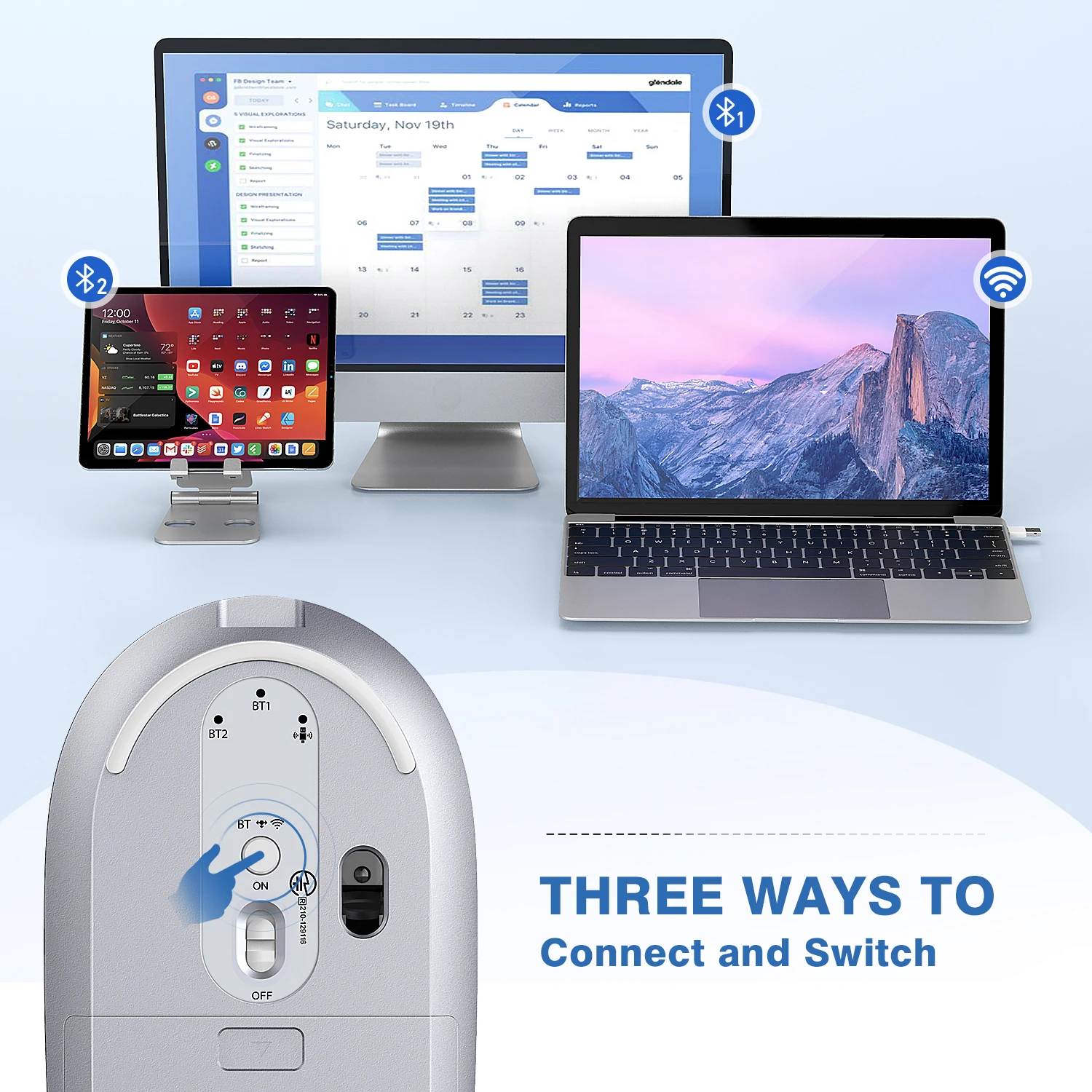 This unit is a handy mouse in three different modes with a wide compatibility with any 2.4GHz USB/ Type-C or Bluetooth 4.0 enabled devices. Super flexible to connect with laptops, tablets, or phones on the go. (NOTE: BT 4.0 system requires: iPad OS 13 or above/ Windows 8.0 or above/ MacOS 10.10 or above/ Android 4.3 or above. Please check before purchase.)