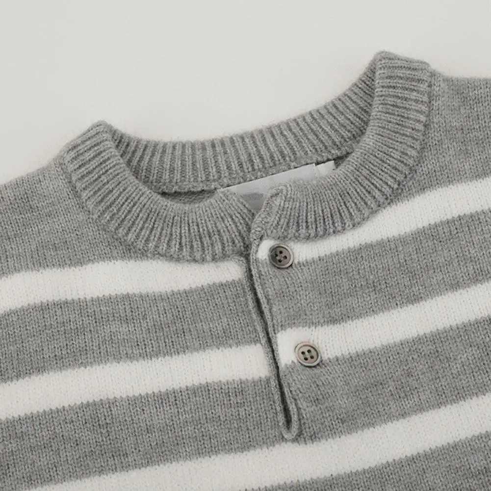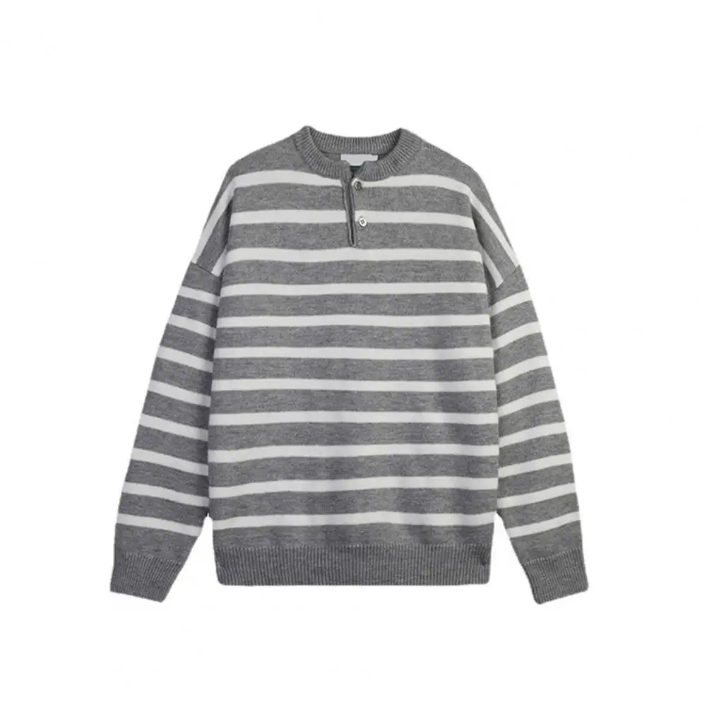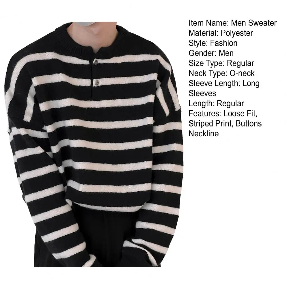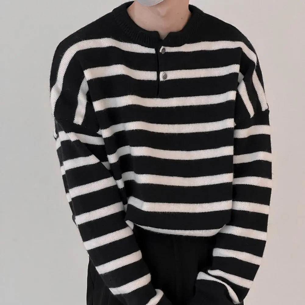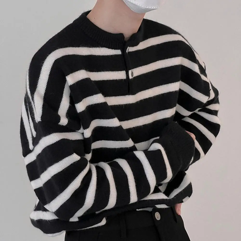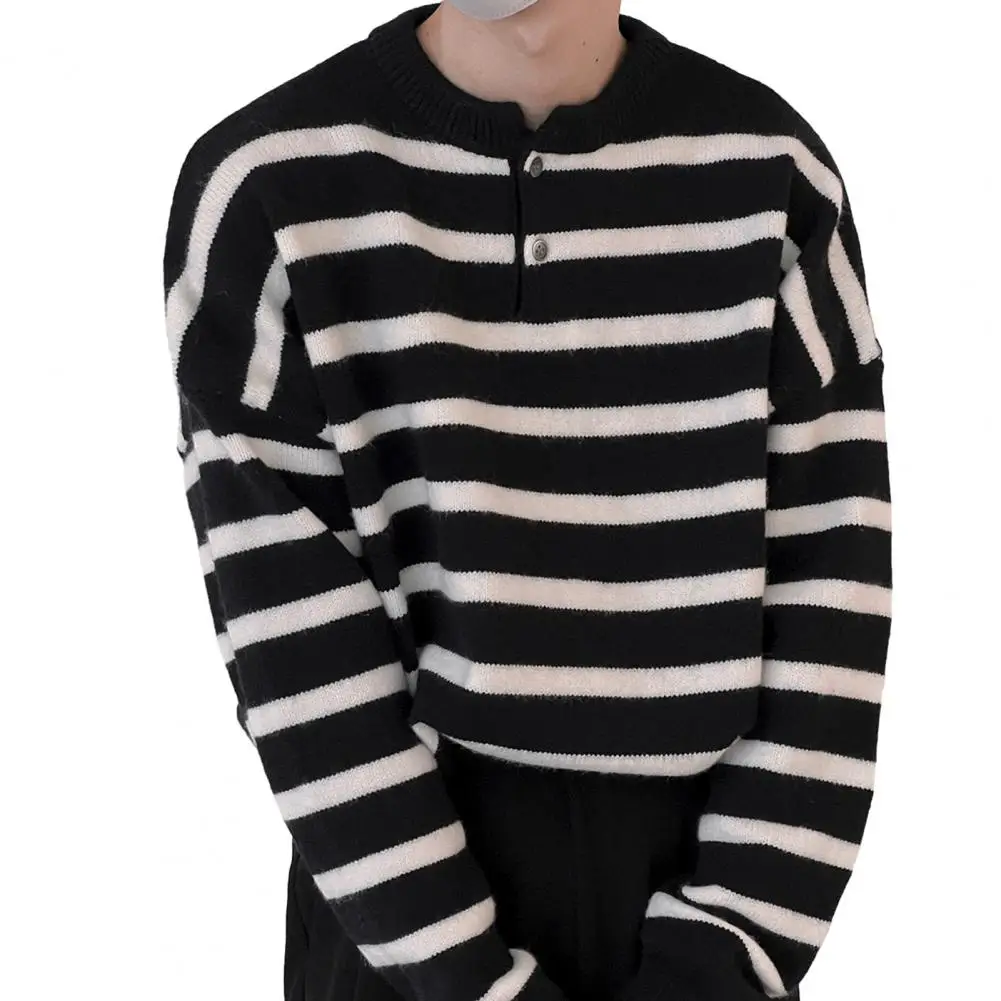Suéter a rayas para hombre, suéter con estampado a rayas para hombre, Jersey de punto con escote de botón, cuello redondo, manga larga para otoño