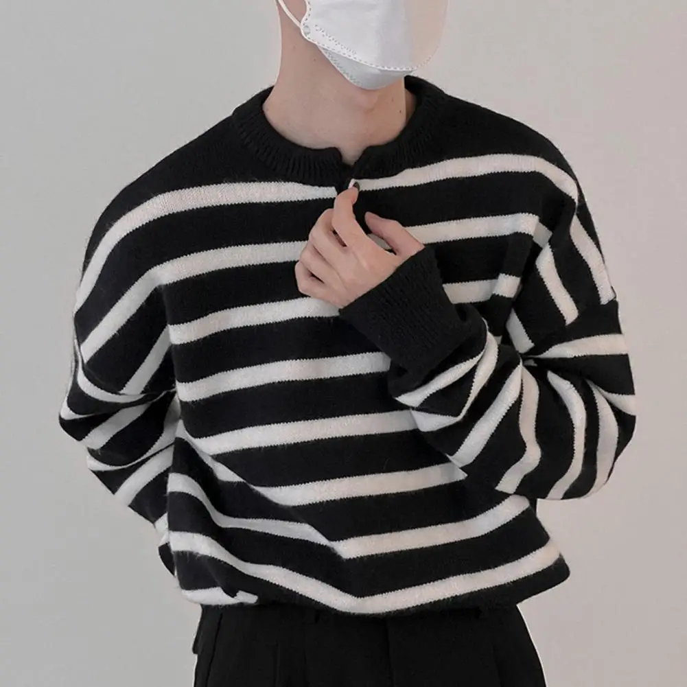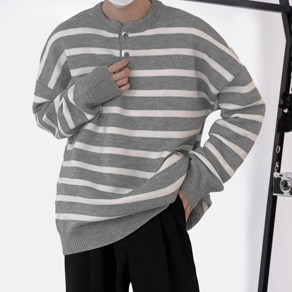 Suéter a rayas para hombre, suéter con estampado a rayas para hombre, Jersey de punto con escote de botón, cuello redondo, manga larga para otoño