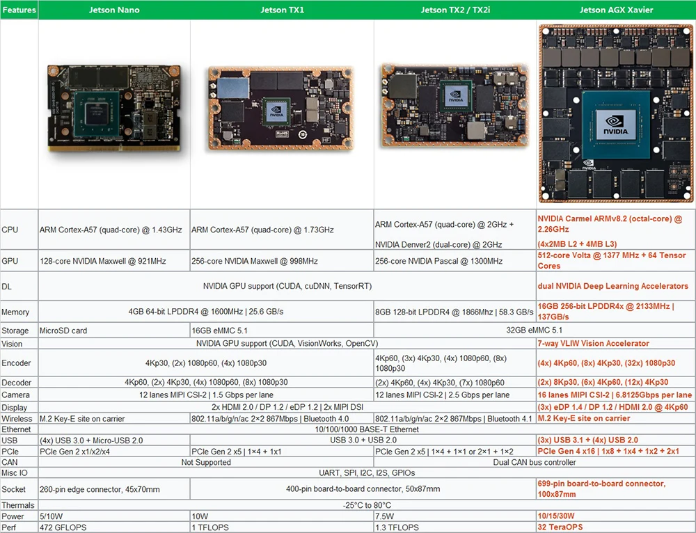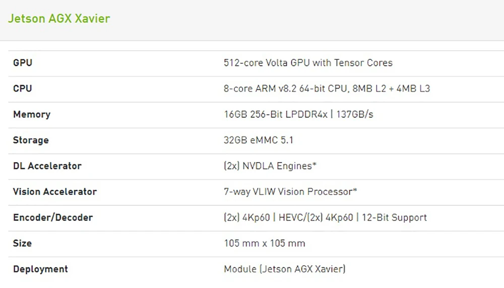 Un pequeño avance en aplicaciones integradasEn sólo 100x87mm ¿Jetson AGX Xavier ofrece gran estación de rendimiento en el 1/10 del tamaño de una estación de trabajo? Esto lo hace ideal para las máquinas autónomas como la entrega y logística robots fábrica sistemas ¿Y grandes industriales vehículos aéreos no tripulados?Actuación en el bordeLa primera computadora del mundo diseñado específicamente para autónoma máquinas jetson AGX Xavier de alto rendimiento puede manejar la odometría visual sensor fusión de localización y mapas de detección de obstáculos y camino de planificación algoritmos crítico para la próxima generación de robots ¡GPU workstation-clase de rendimiento con un incomparable 32 TeraOPS (TOPS) de pico de calcular y 750 Gbps de velocidad/O en un compacto 100x87mm ¡factor de forma!El poder de la flexibilidadLos usuarios pueden configurar modos de funcionamiento en 10 W 15 W Y 30 W como necesario para sus aplicaciones permite nuevos niveles de calcular la densidad de la eficiencia energética Y AI inferencing capacidades en el bordeLa tecnología de las especificaciones